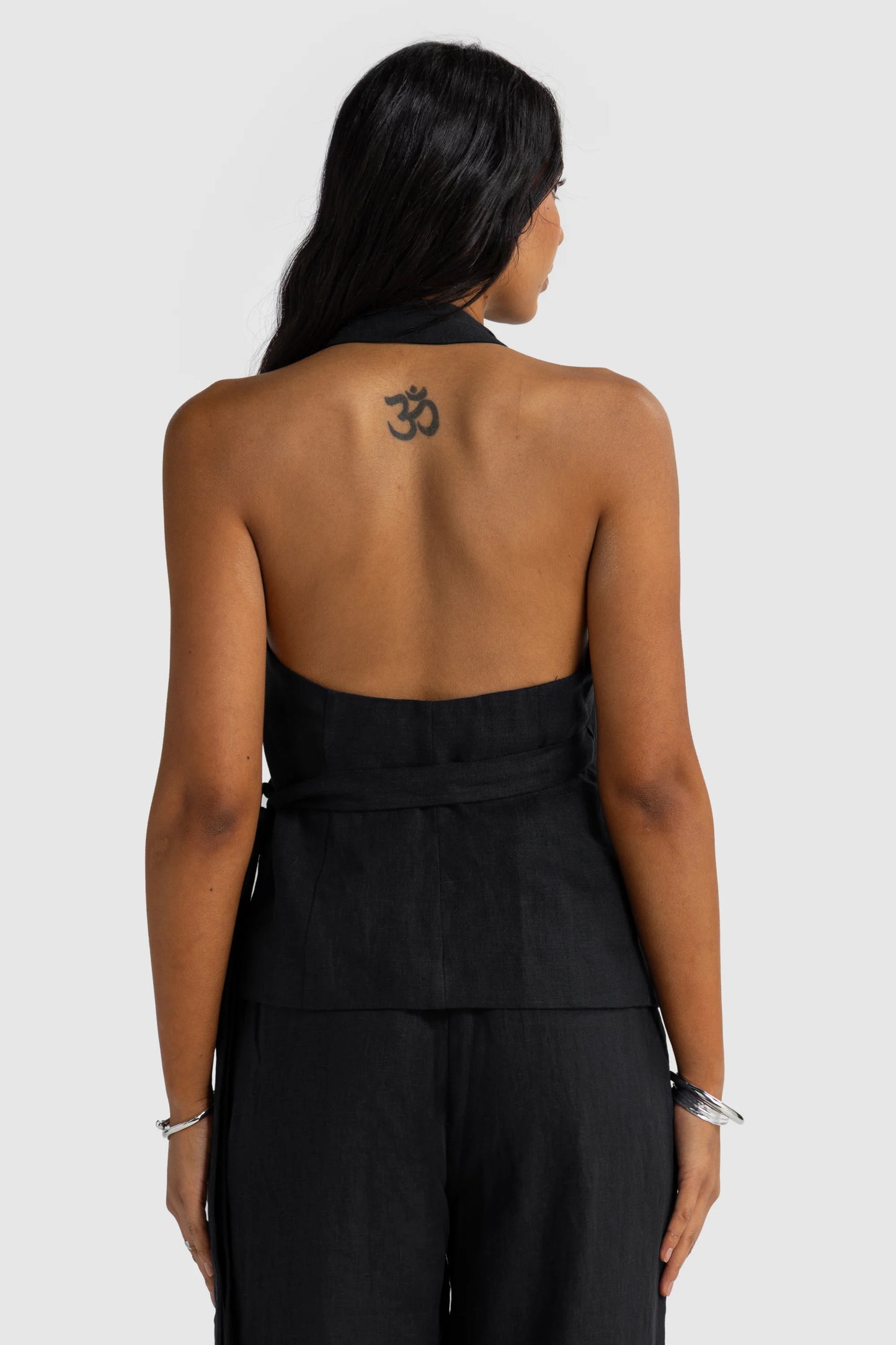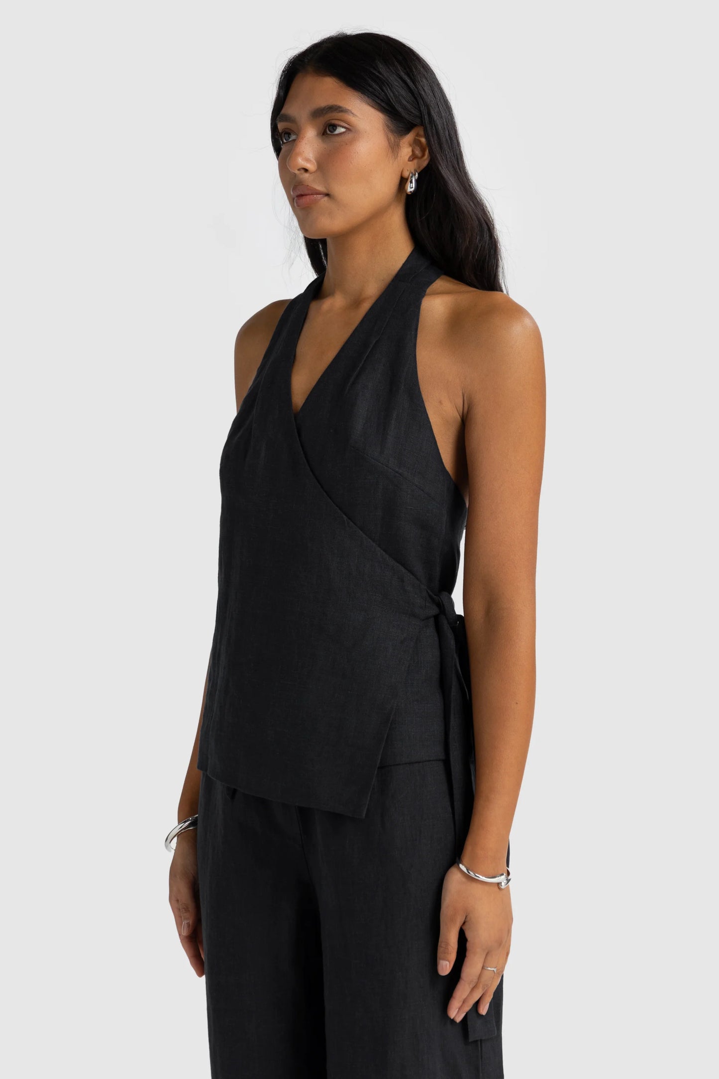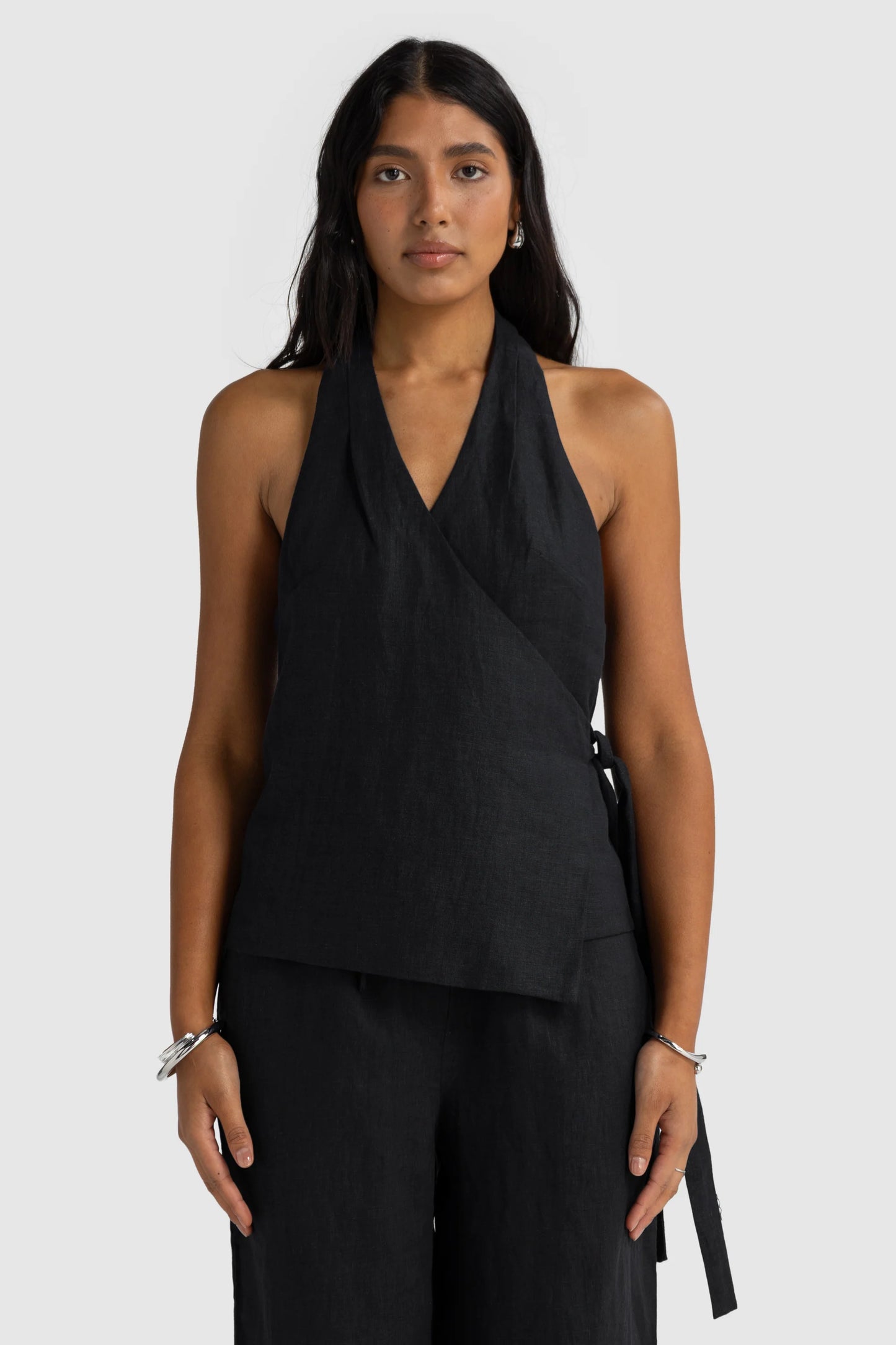 Chic and effortlessly feminine, the Elise Linen Wrap Top is crafted from breathable mid-weight linen. Featuring a halter neckline, plunging front, and open back, it ties at the waist with a matching wrap belt for a flattering fit. Pair it with any of our denim bottoms or linen shorts for a coordinated summer look.
