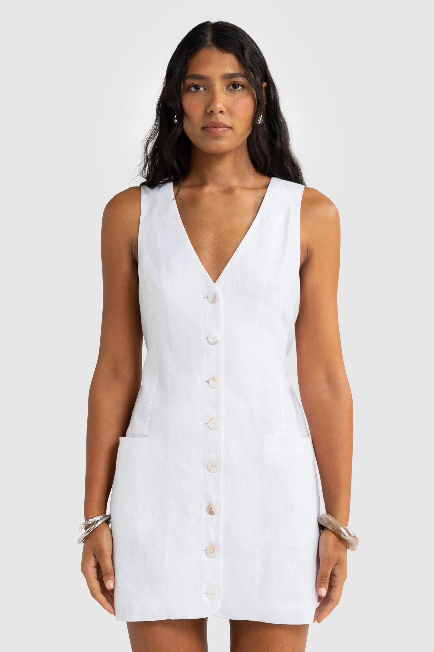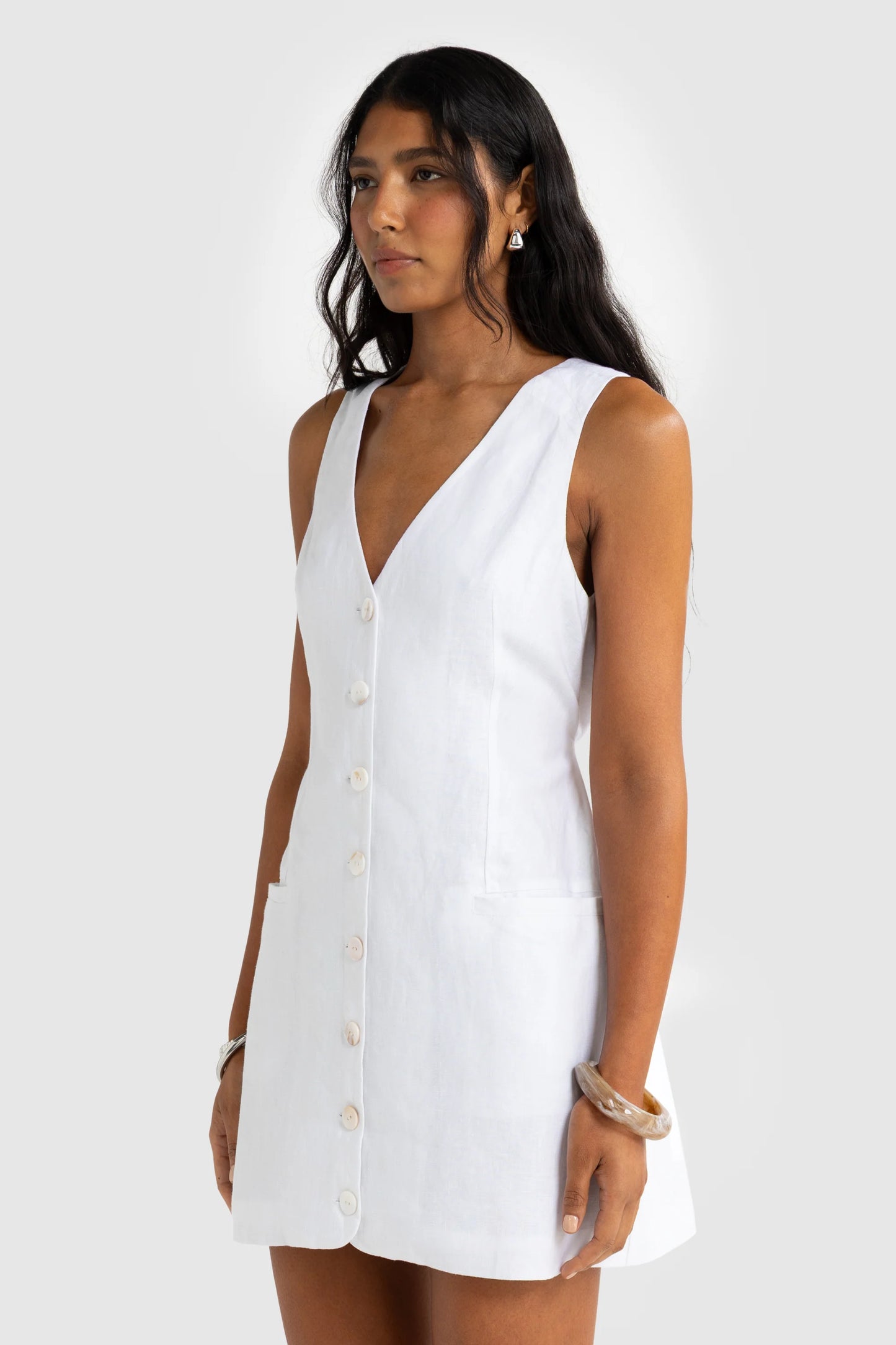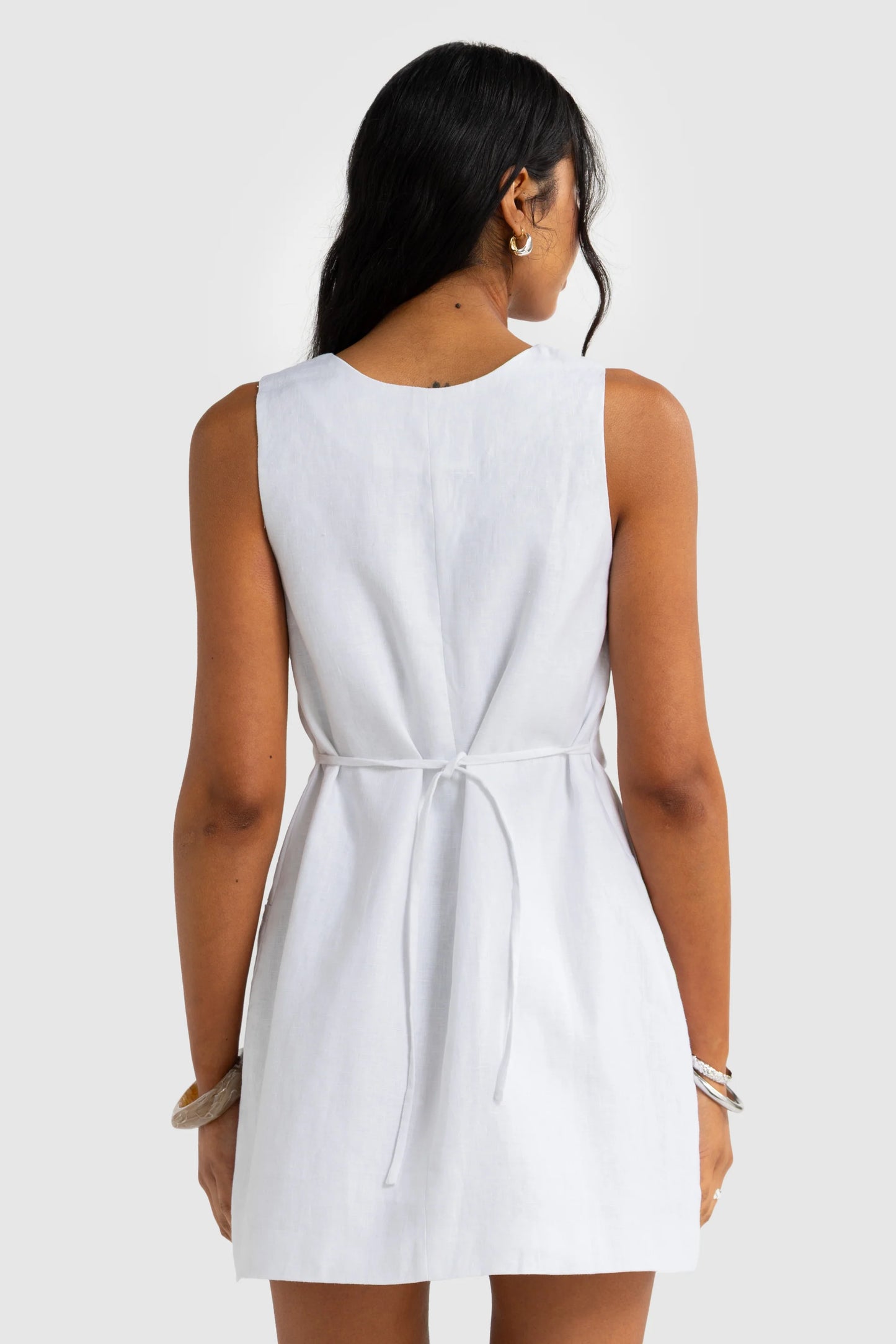 Timeless and effortlessly cool, the Koda Linen Mini is your go-to for warm-weather dressing. Made from 100% linen and fully lined, it features a flattering V-neckline, contrast buttons, and a clean, structured silhouette. A fabric tie at the back lets you cinch the waist for a more tailored fit. Style with heels or sandals for a versatile look.
