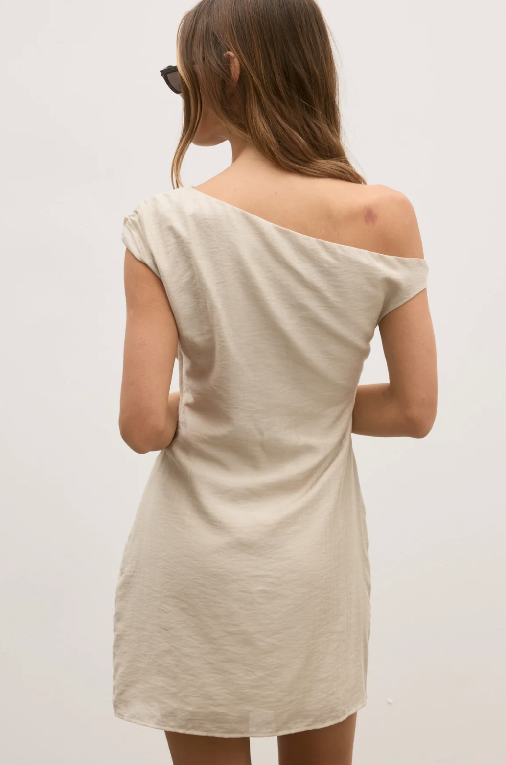 The Amaya Dress captures effortless sophistication with its asymmetric, one-shoulder silhouette. Crafted from a lightweight, textured fabrication, it drapes softly over the body while subtle side gathering adds shape and movement. The minimalist cut and neutral hue make it an easy go-to for elevated daytime dressing or refined evening looks.