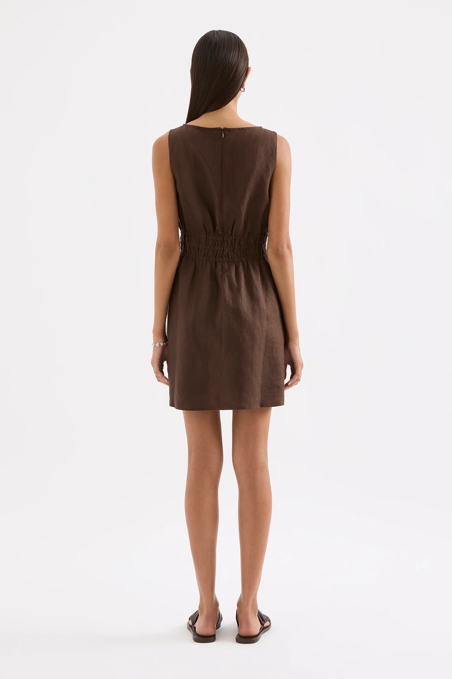 The Andri Linen Mini Dress is made from premium linen fabrication with a breathable, soft hand feel. This mini dress features a high boat neckline, shirred elastic waist, side seam pockets, invisible zipper at back and gathers at front neck.