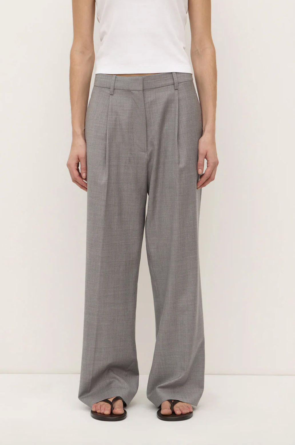 The Jaina Suit Pant in grey marle is a lightweight 100% wool tailored pant with a classic silhouette, structured shape, front pleats, and a fixed waist with belt loops.