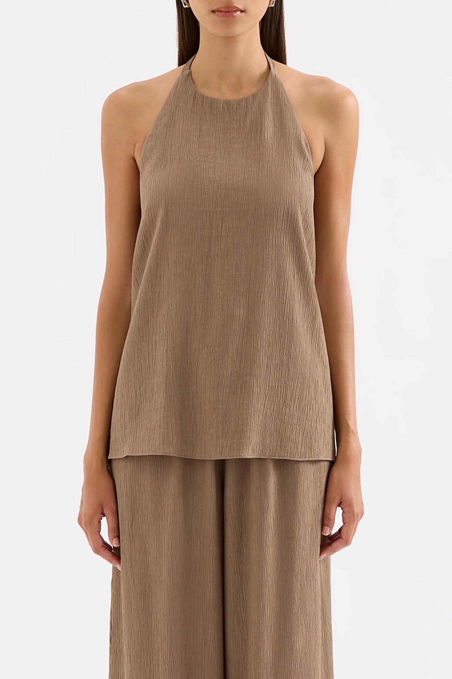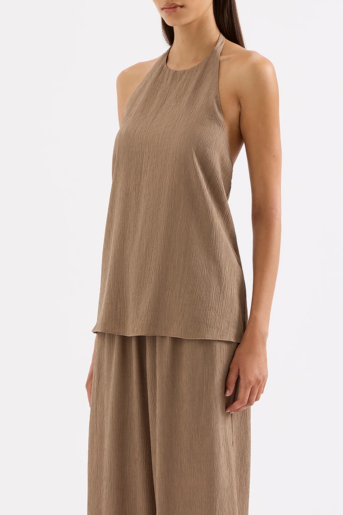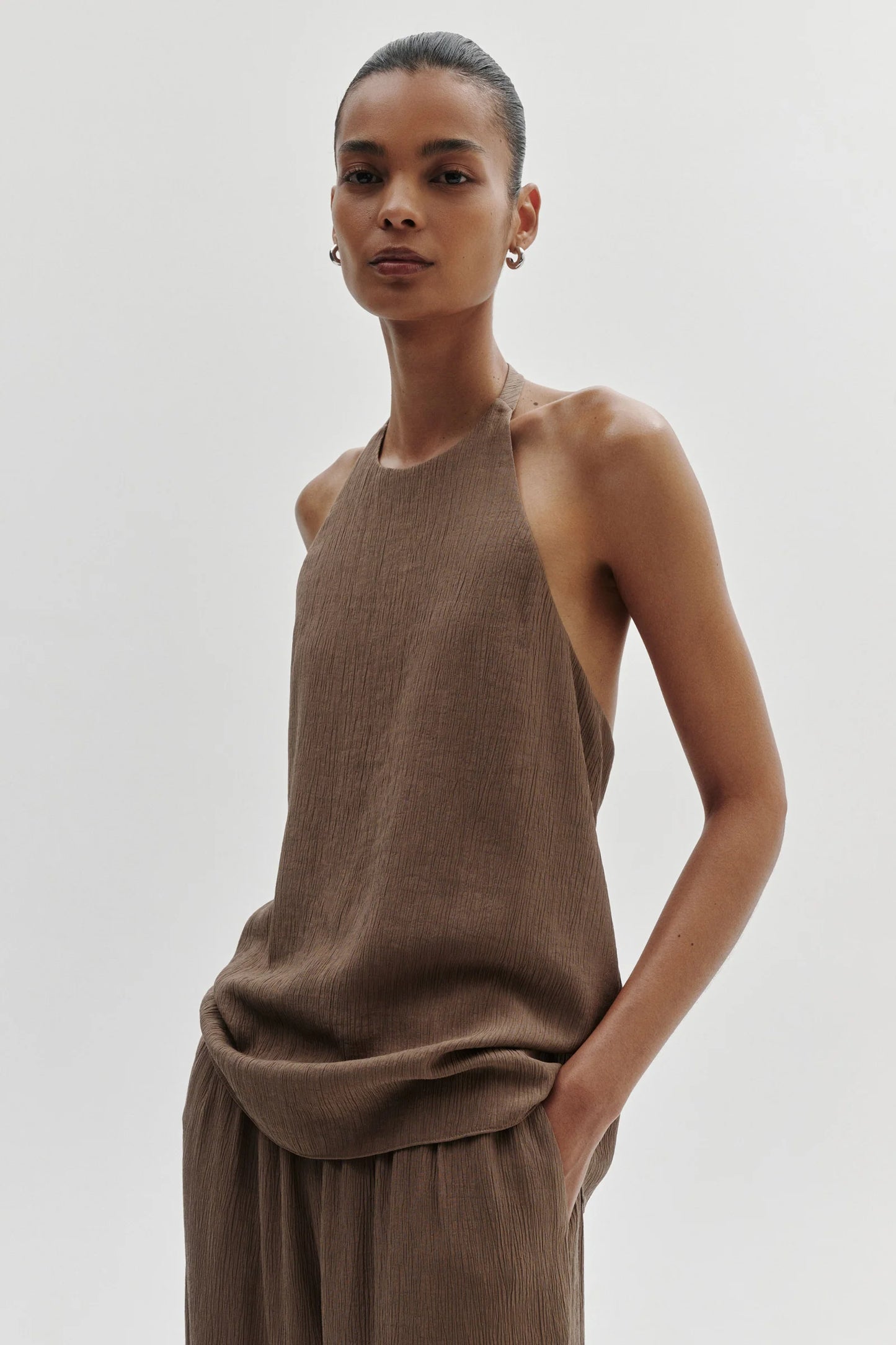 The Winfield Top is designed from a lightweight crinkle fabrication with a dry hand feel. It features a high halter neckline, back neck button fastening, open back with two tie closures and finishes below the hip. This top is fully lined.