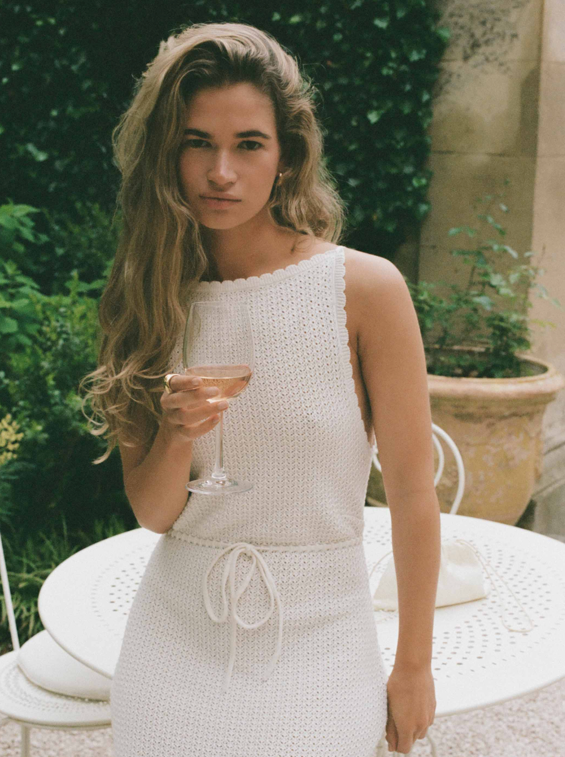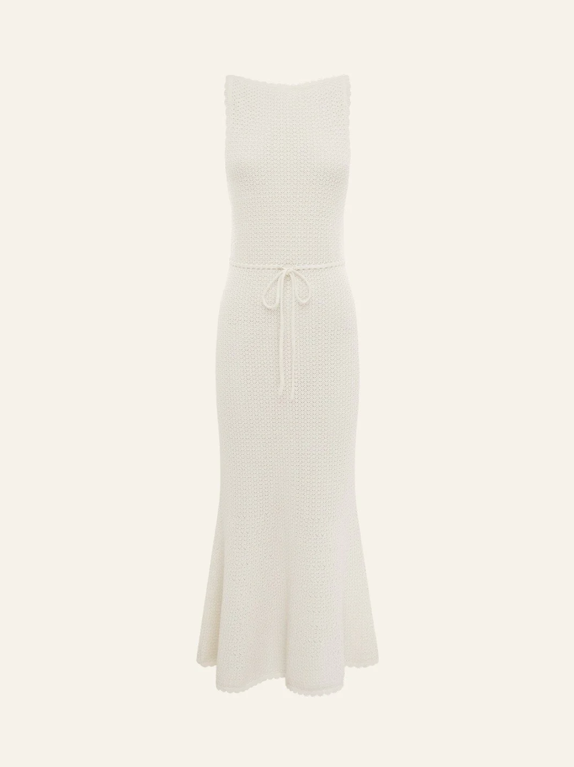 Introducing the Pointelle Forever Midi Dress — a silhouette of quiet romance and enduring beauty. Crafted from our new finer–gauge knit to gently flatter the form, it features a graceful boat neckline, delicate shoulder straps, and a functional waist tie. Skimming the body before falling into a softly flared, mermaid–style skirt, it moves with effortless elegance from day to evening.