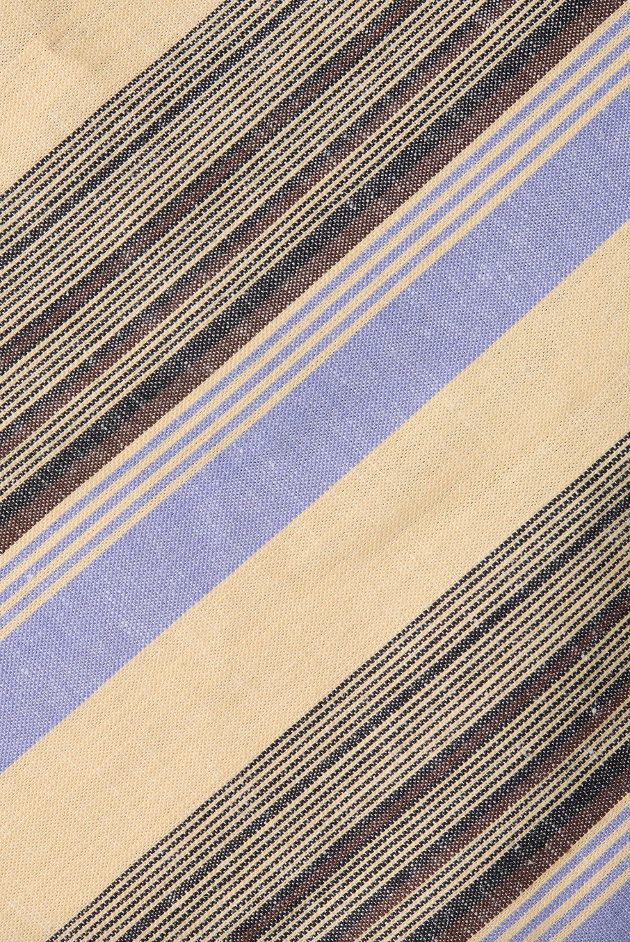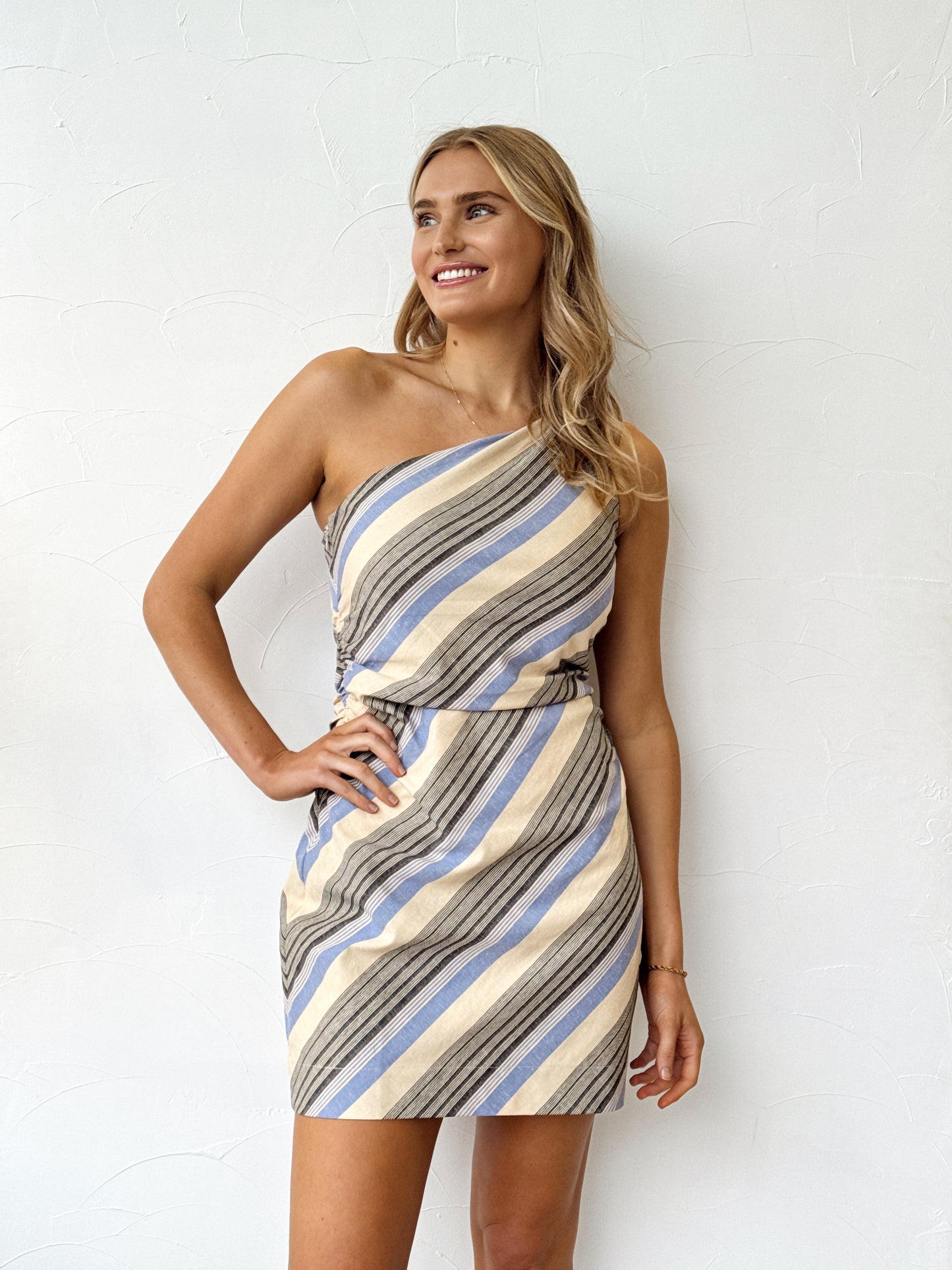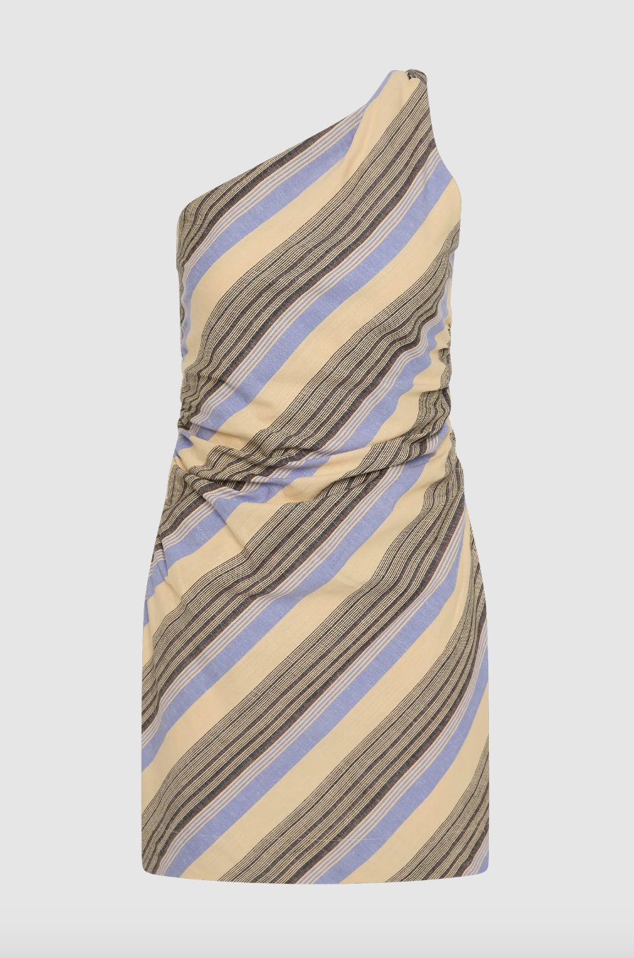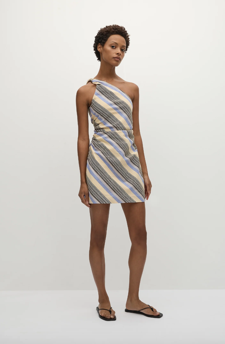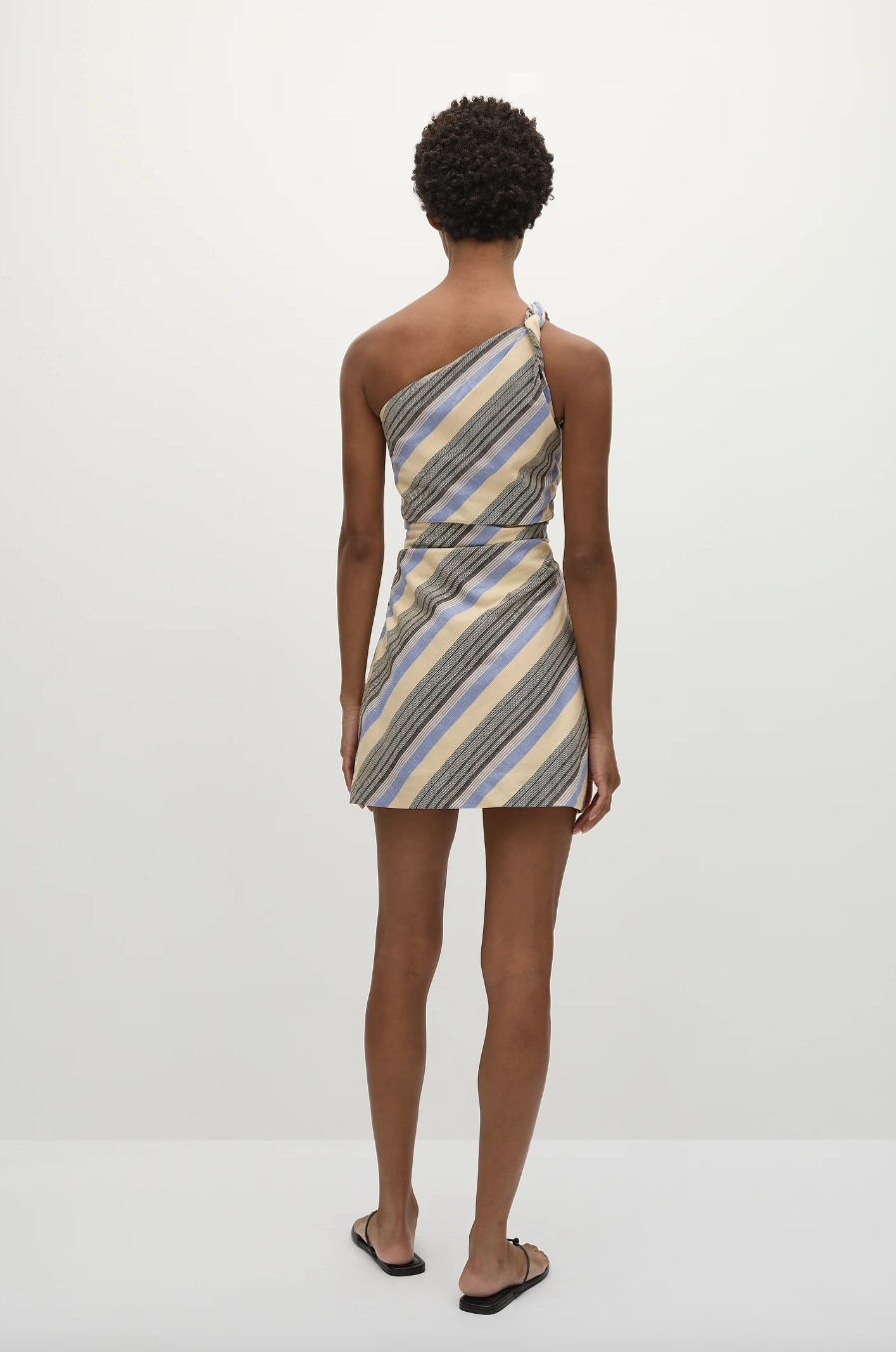 Regular price $230.00 AUDA one-shoulder mini dress, designed from a unique blend of organic cotton and European Flax® linen, yarn-dyed in a multi-colour stripe, inspired by the sun setting over the ocean. It features a twist tie detail at the shoulder and a slightly cinched waist with gathering on the side for a more flattering silhouette. Semi-fitted through the body, it finishes with a straight skirt cropping short. Style with a sandal or kitten heel for vacation dressing.