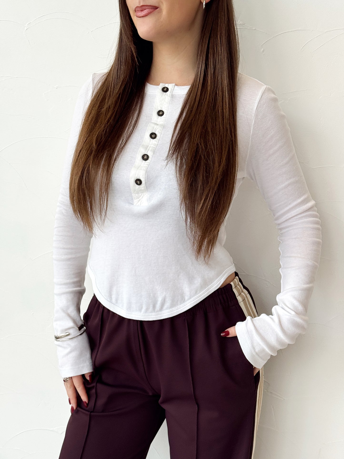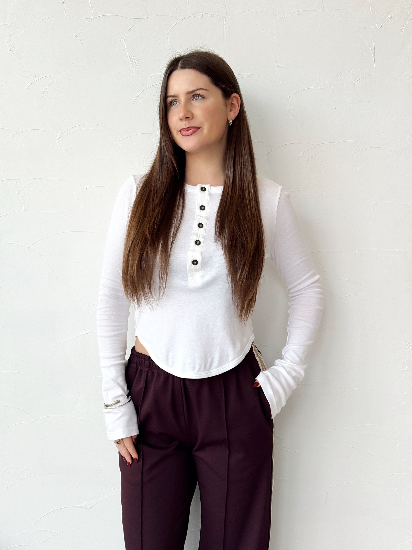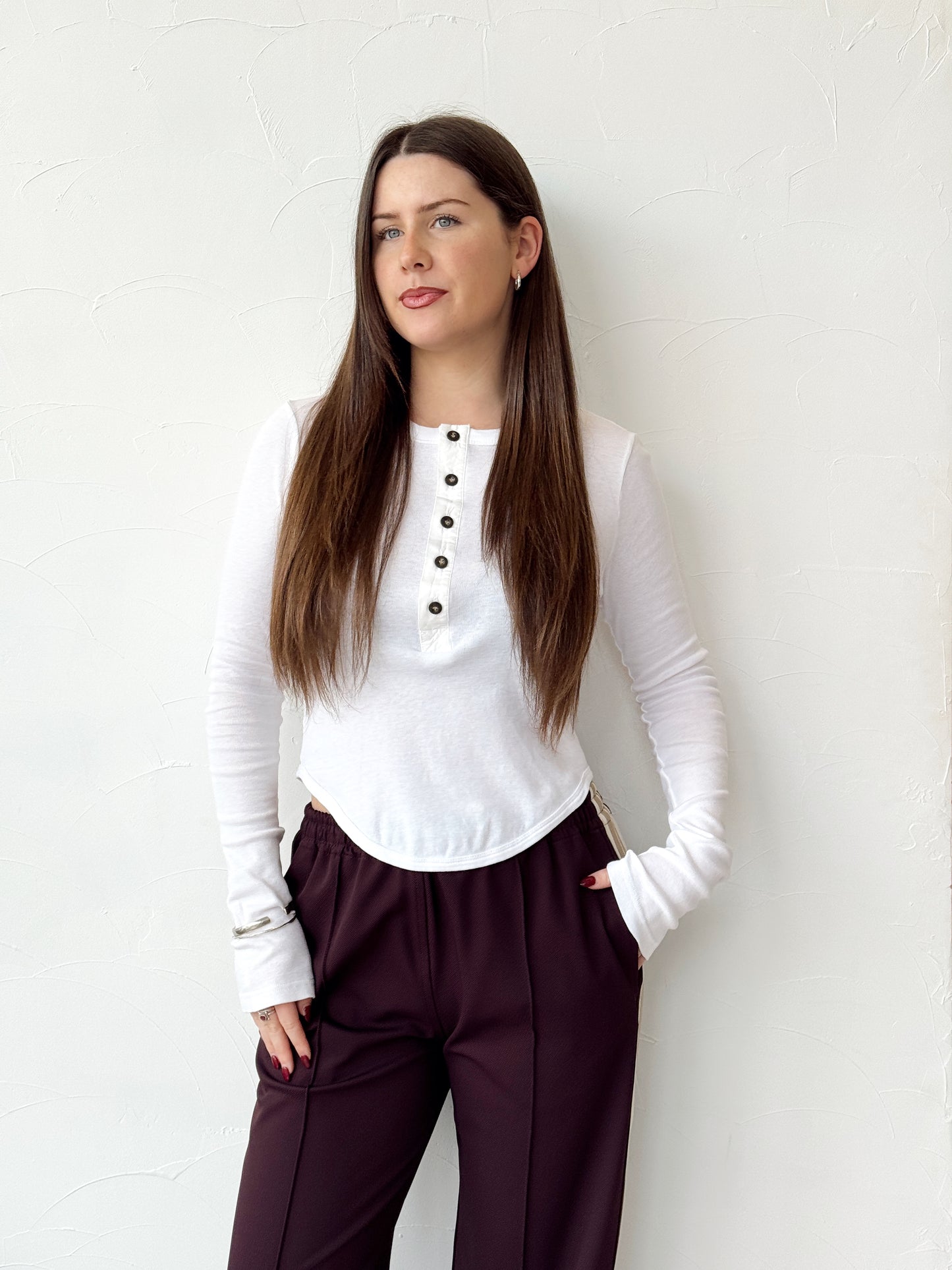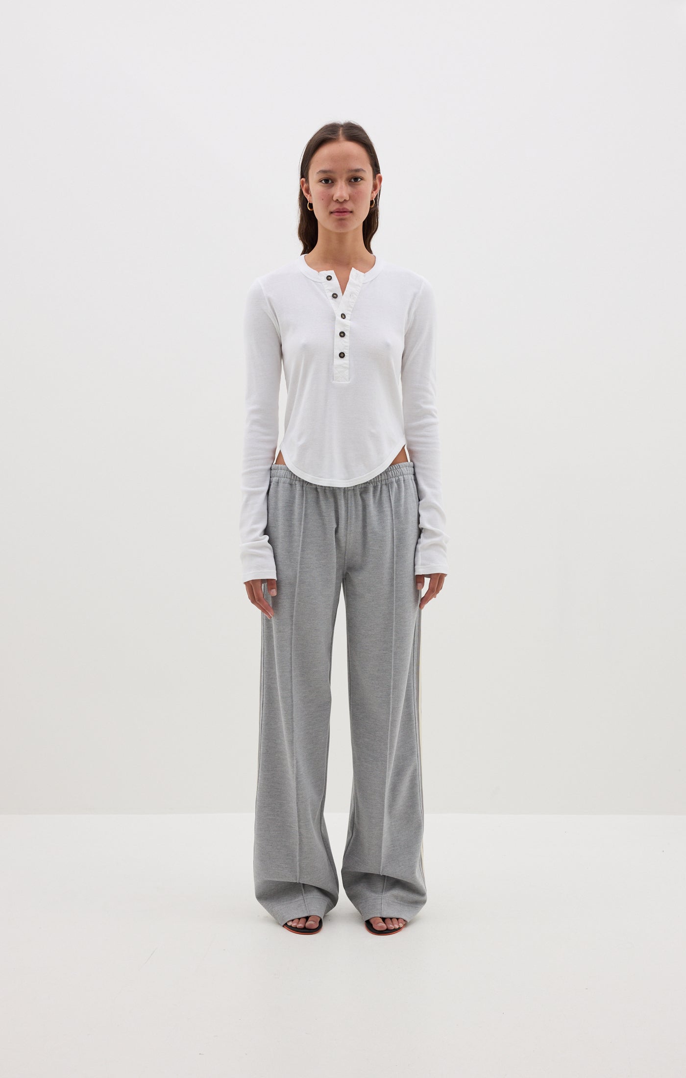 Regular price $170.00 AUDCrafted from 100% organic superfine rib, knitted in Australia, the Scoop Hem Placket T-Shirt is designed for a slim fit. This long sleeve silhouette features a curved scoop hem with a bound edge and a contrast cotton placket at centre front for a refined finish.