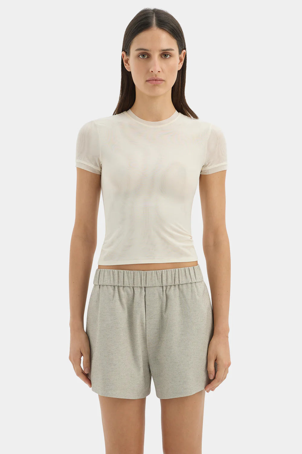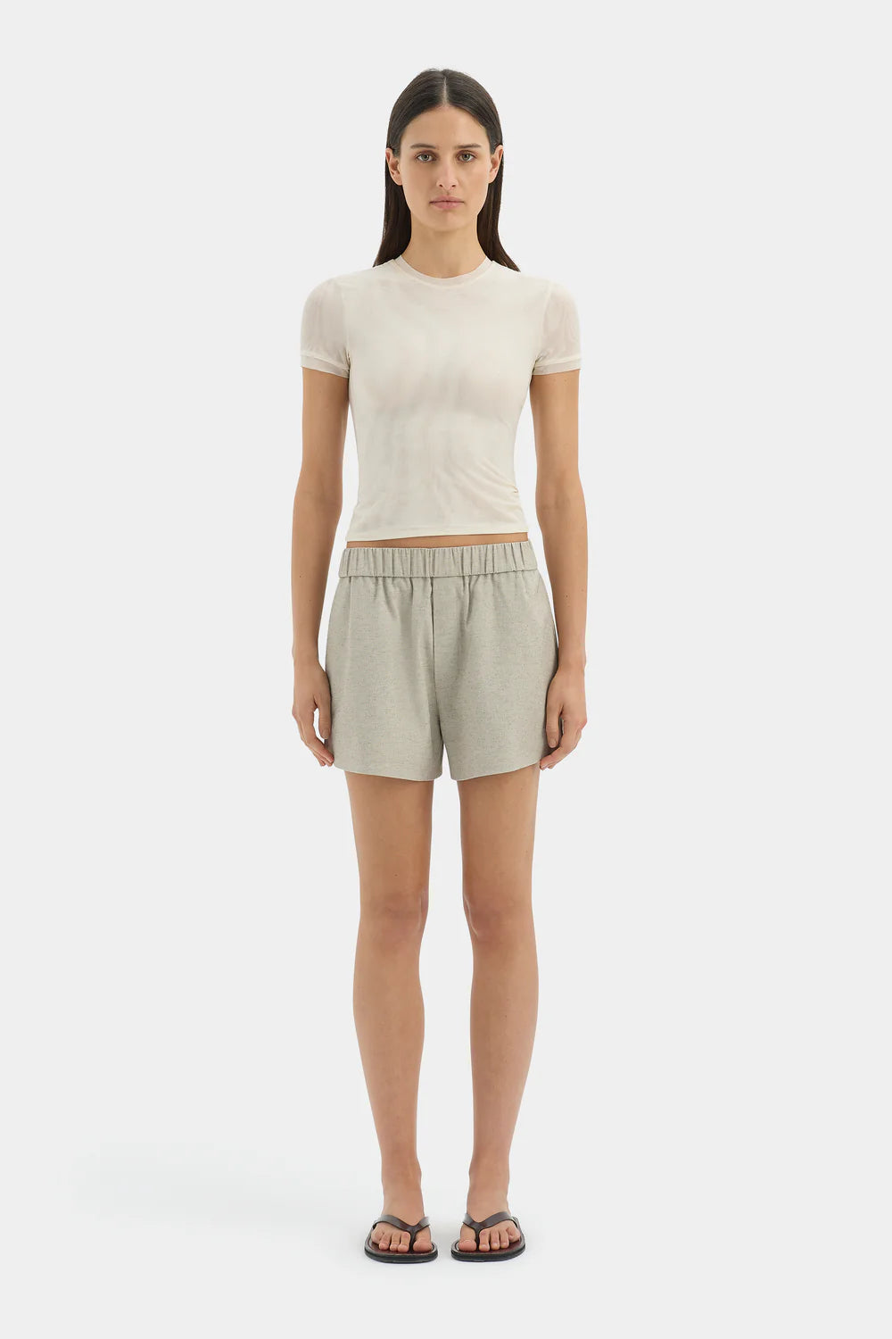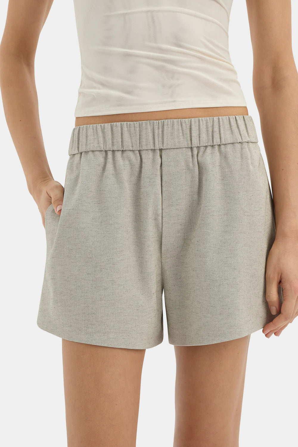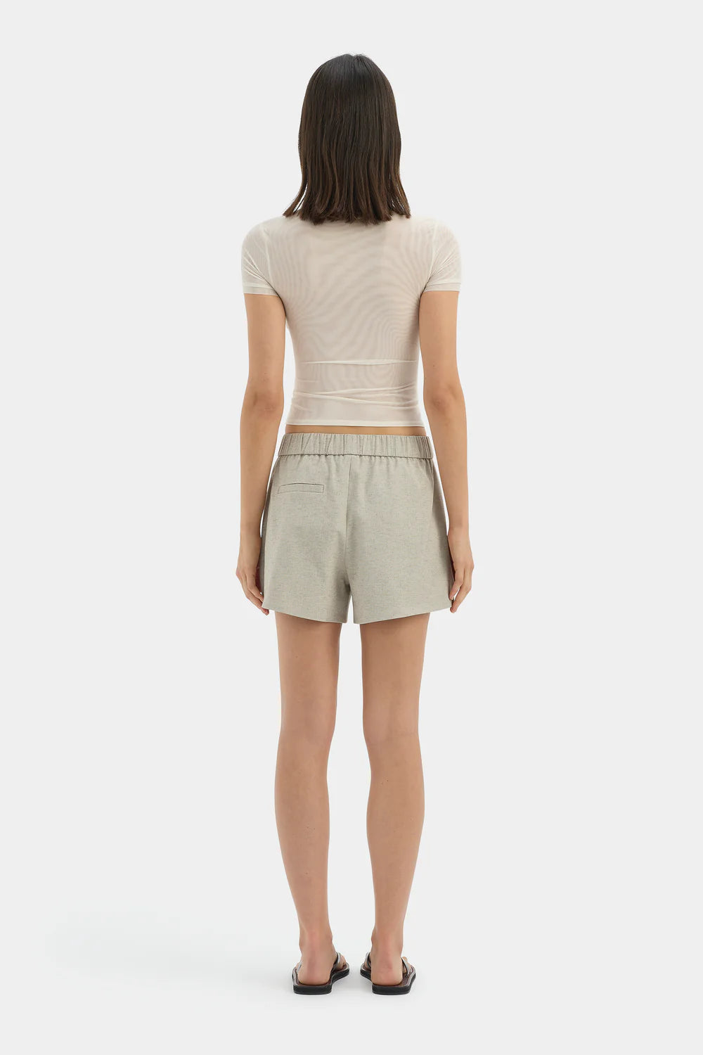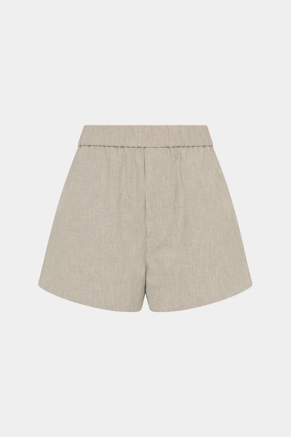 The Leone Gathered Short in Natural is a casual silhouette, tailored from a lightweight suiting fabrication with a textured handfeel. Designed to sit high at the waist, it features an elasticated waistband, inseam pockets and a wide leg shape.