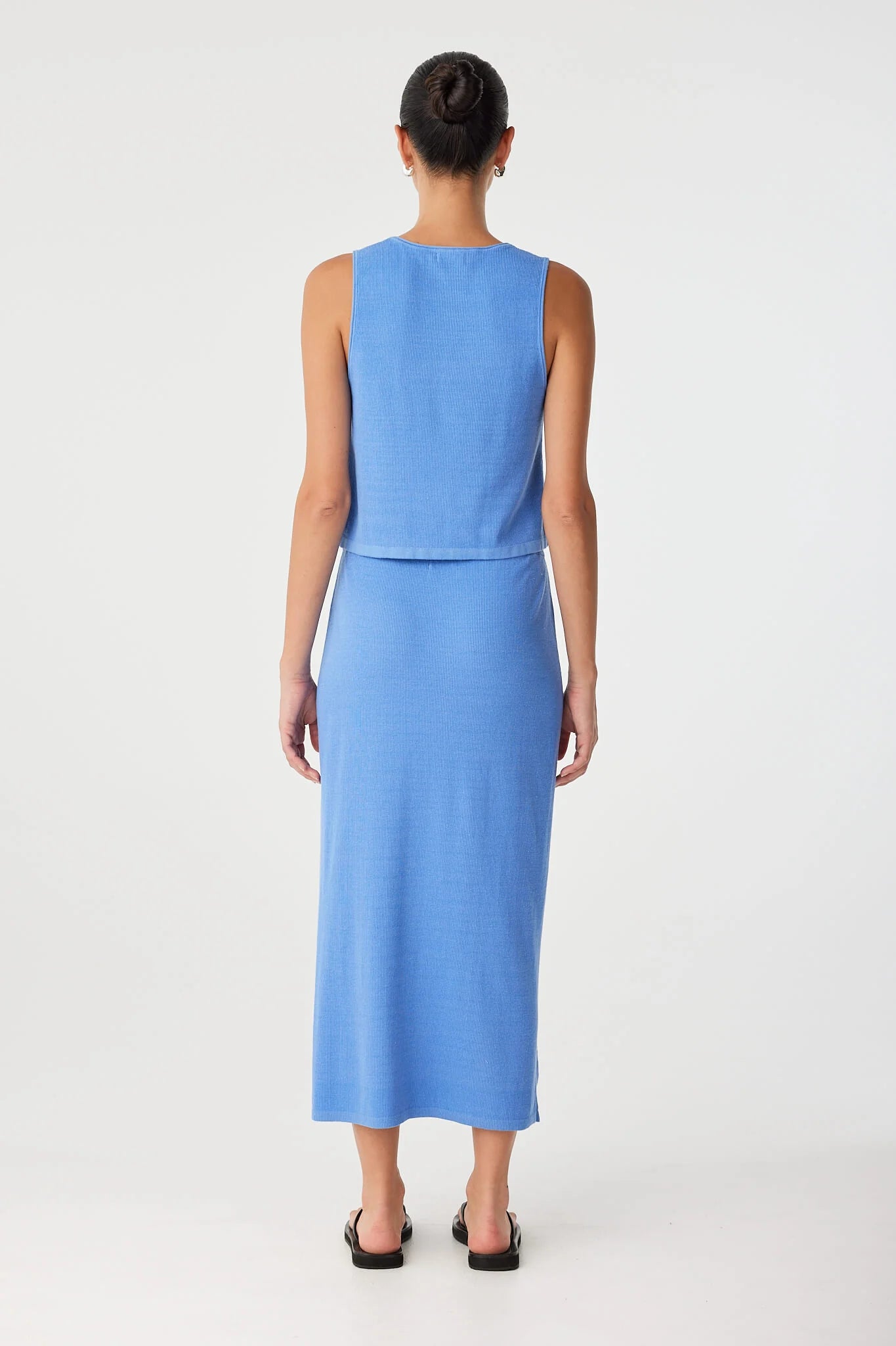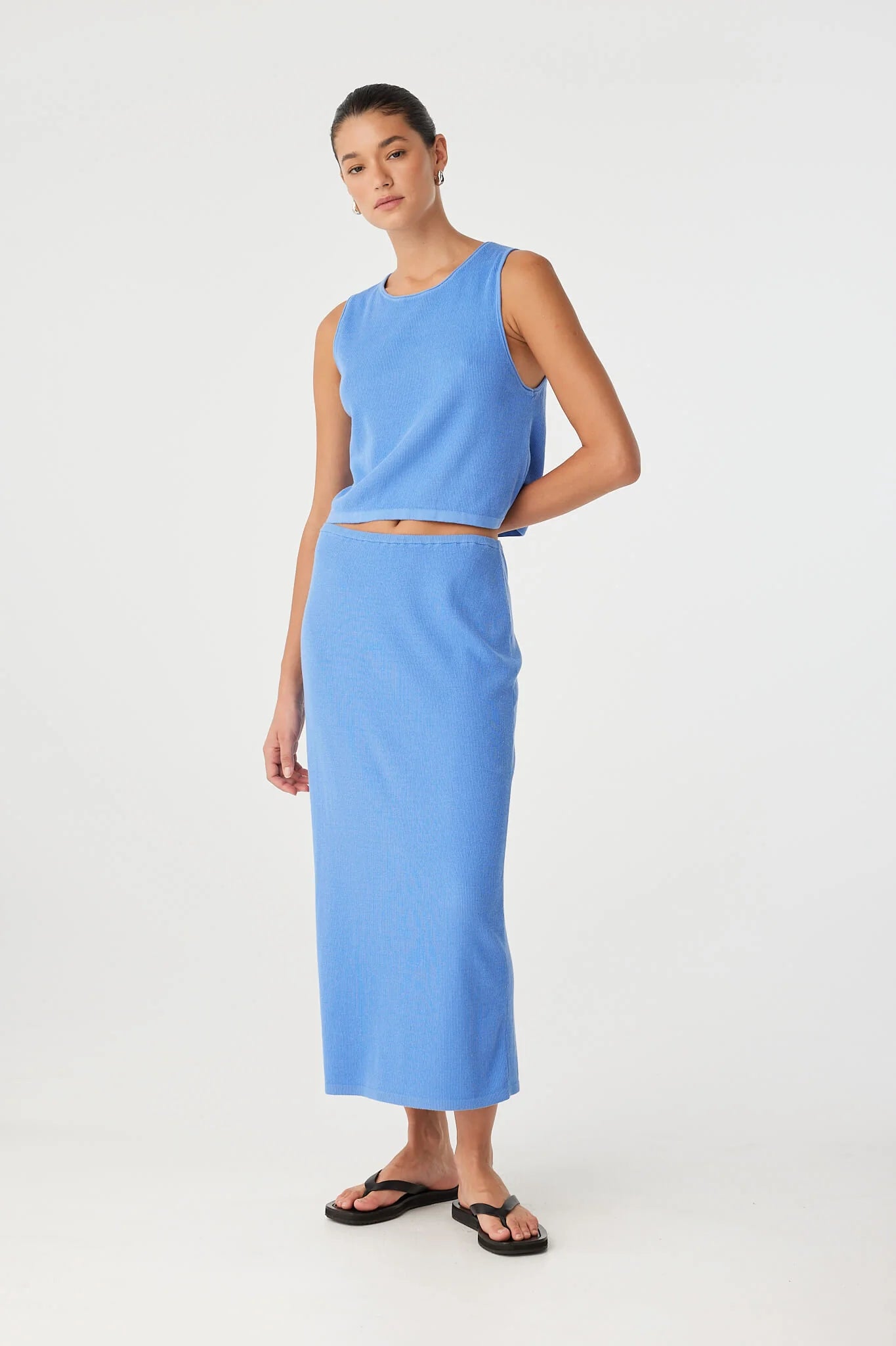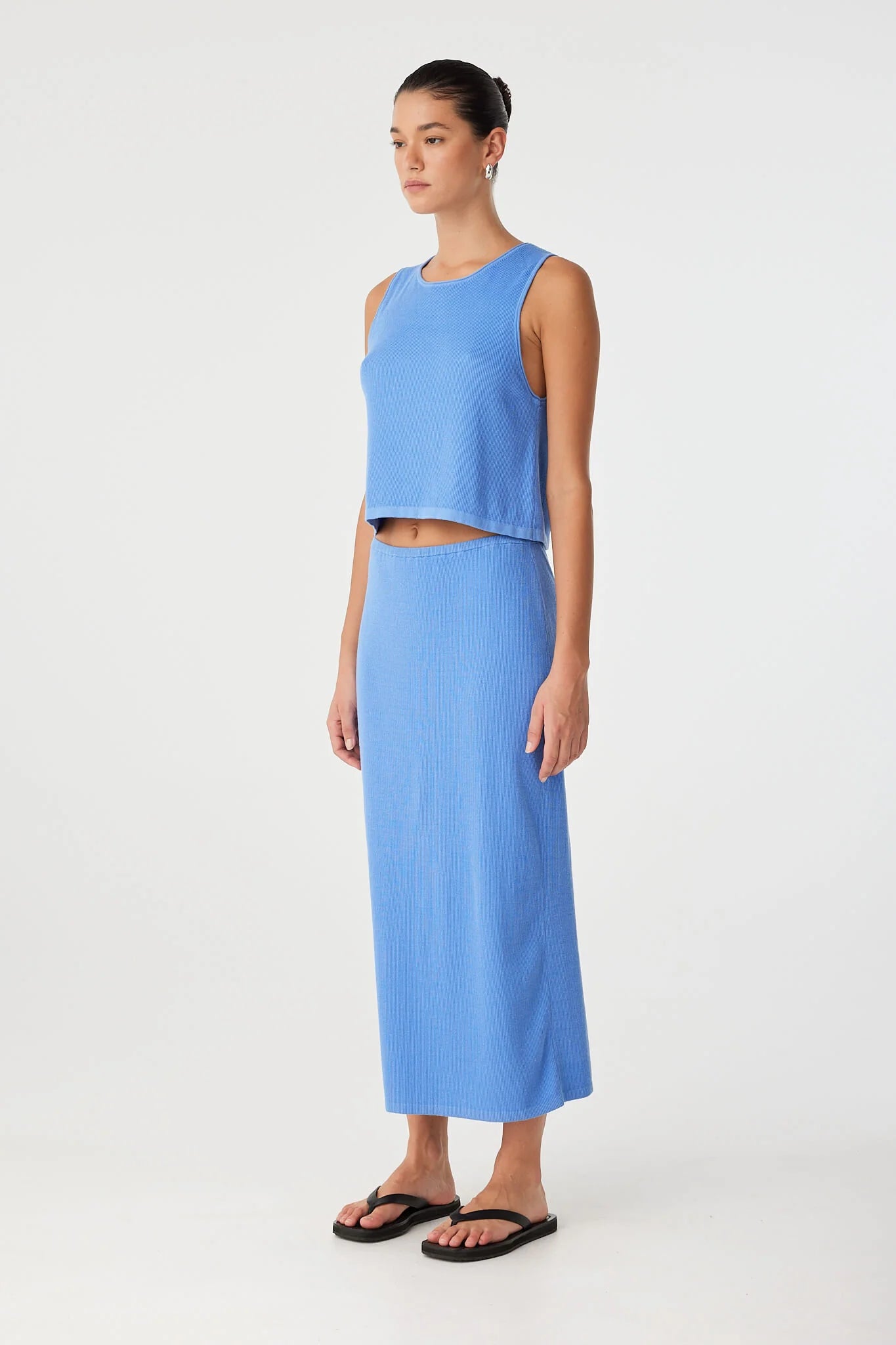 A lightweight ribbed knit skirt with soft movement and versatile waist styling. The Theo Skirt features a streamlined silhouette and gentle stretch, worn high or low on the waist.