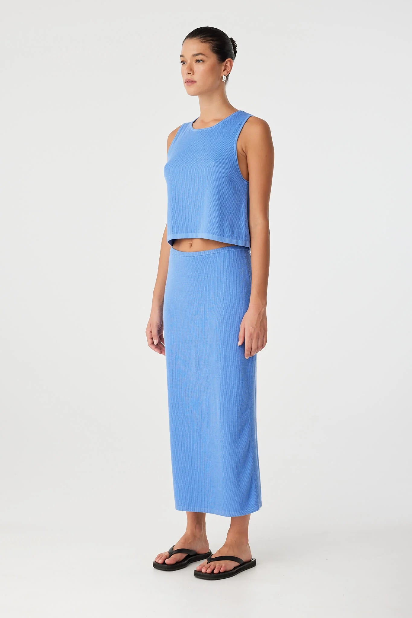 A lightweight, ribbed knit tank with a relaxed shape and flared hem. The Theo Tank features a rolled neckline and armholes for a natural, unstructured finish.