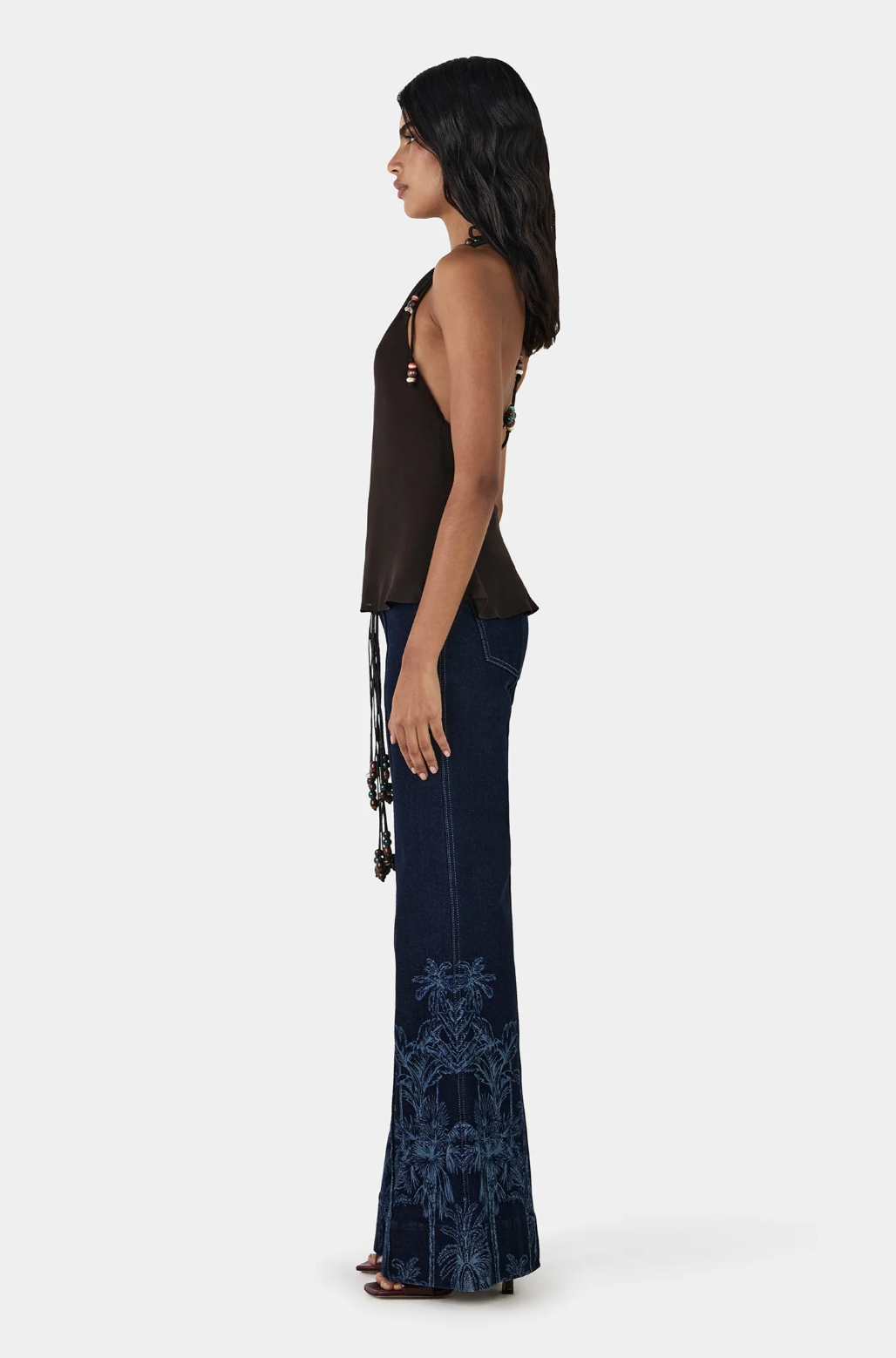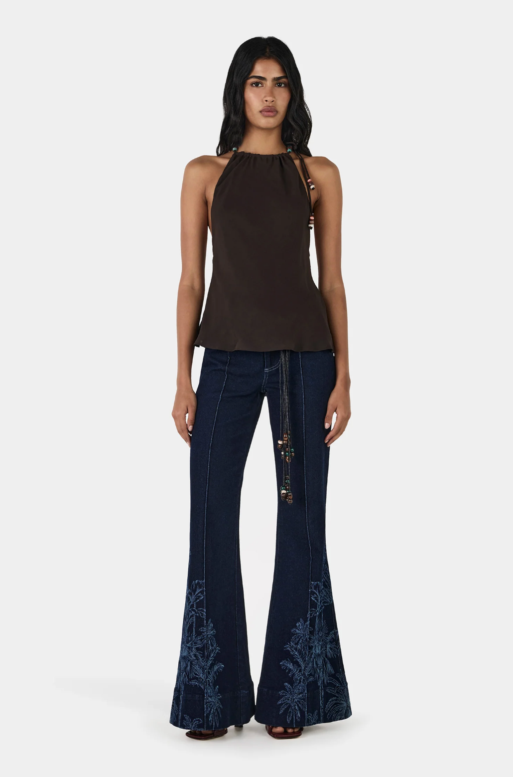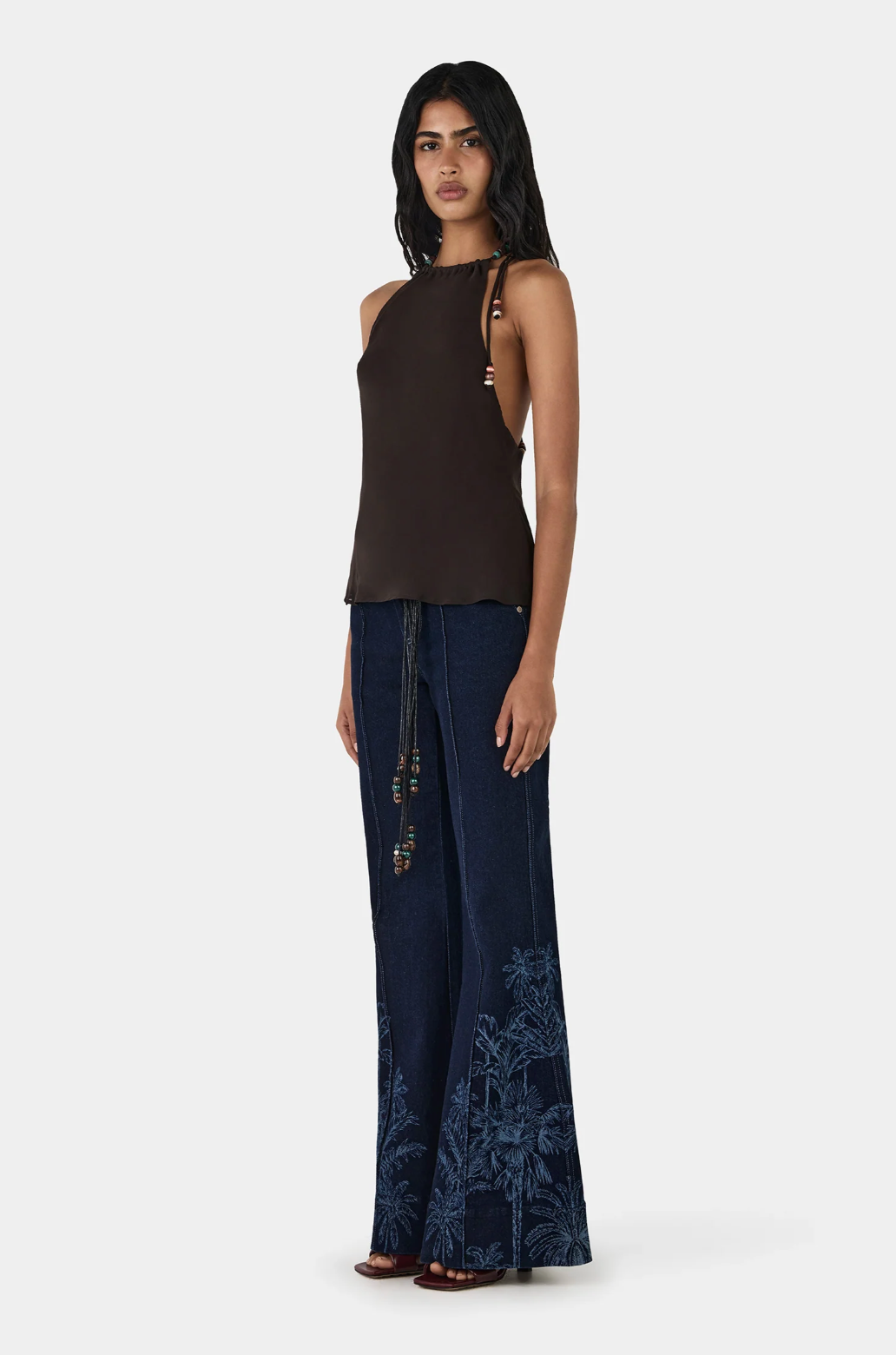 • Halter-style top with open back and beaded detail