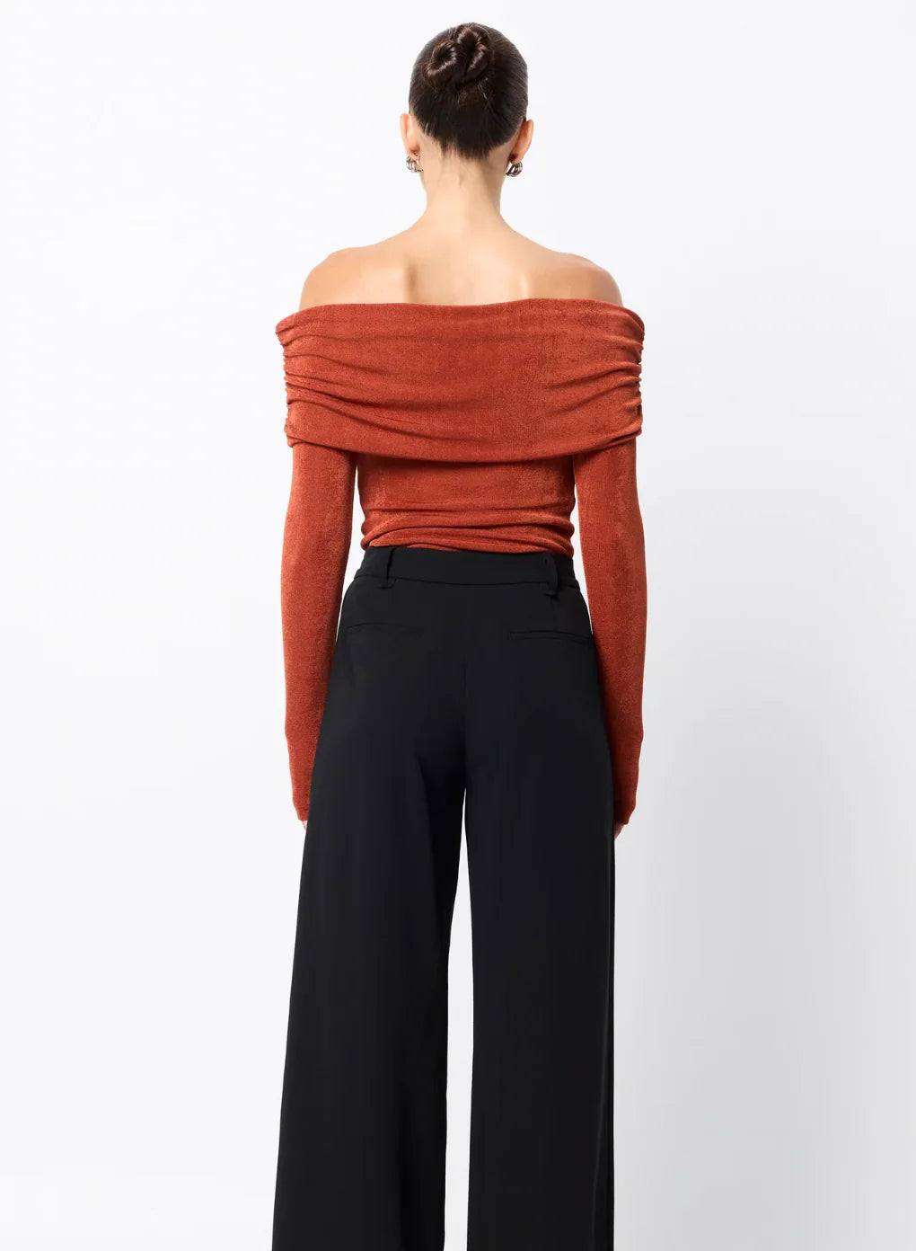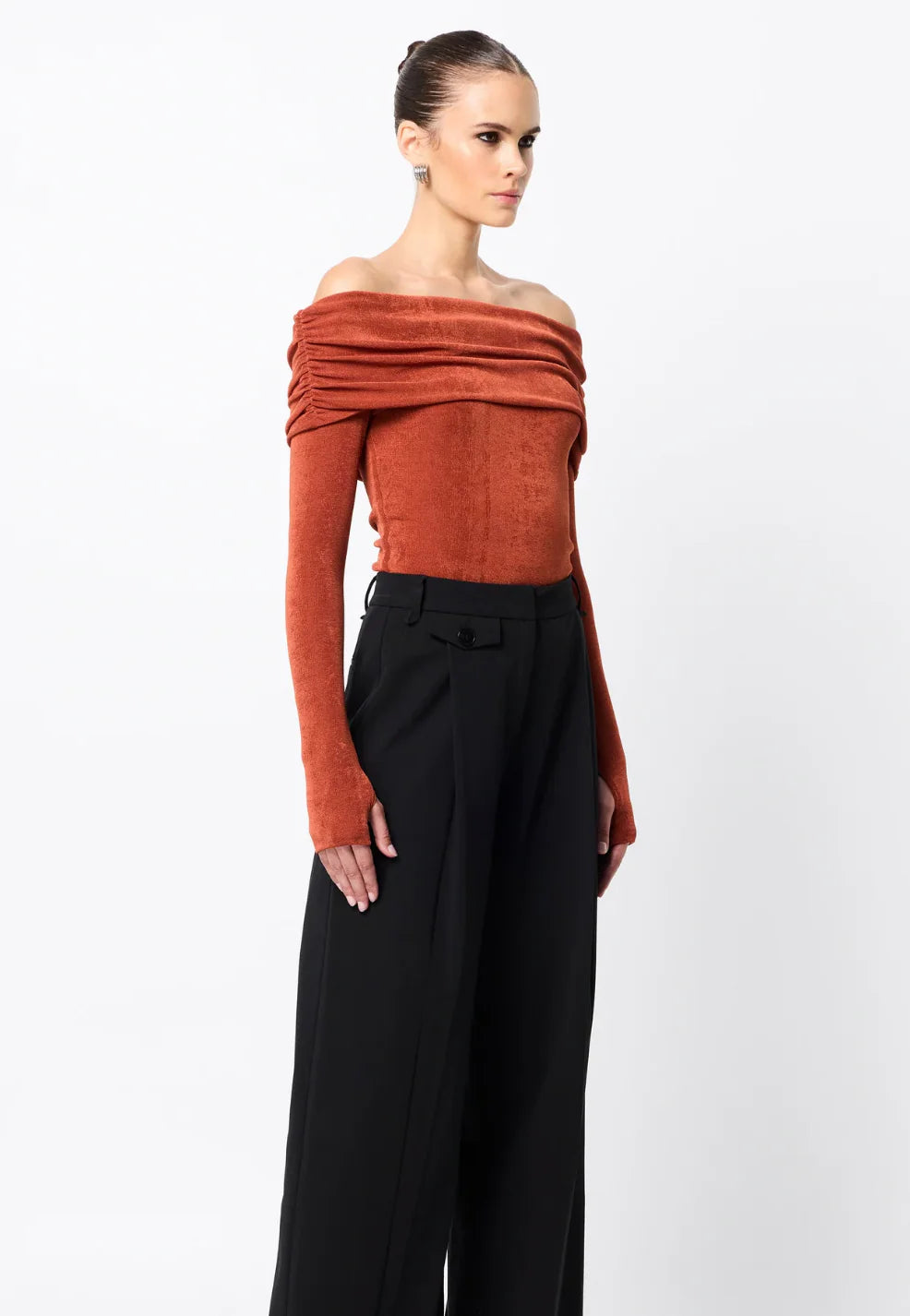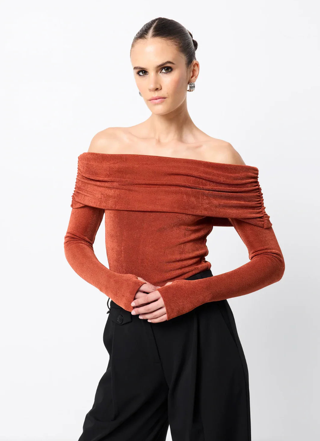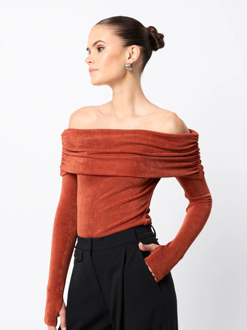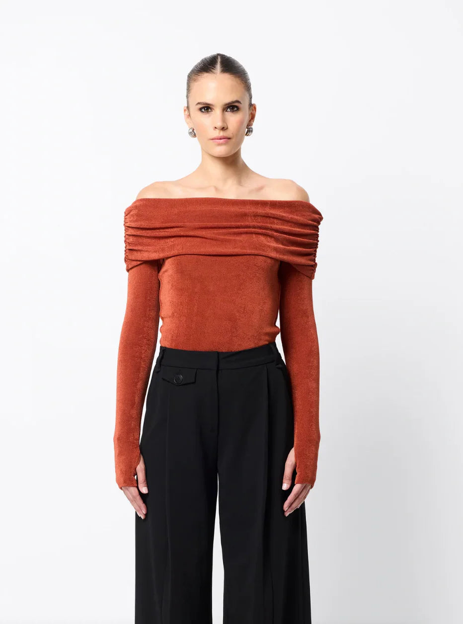 The Oblivion Top in Rust is a sleek fusion of elegance and ease. Crafted from a lustrous, double-layered jersey, it offers a soft, stretch fit that flatters the form. Featuring an off-shoulder Bardot neckline with ruched shoulder detail and long sleeves, this statement silhouette is both modern and refined. Whether worn solo or layered under outerwear, it pairs effortlessly with denim or tailoring for a sophisticated day-to-night ensemble.