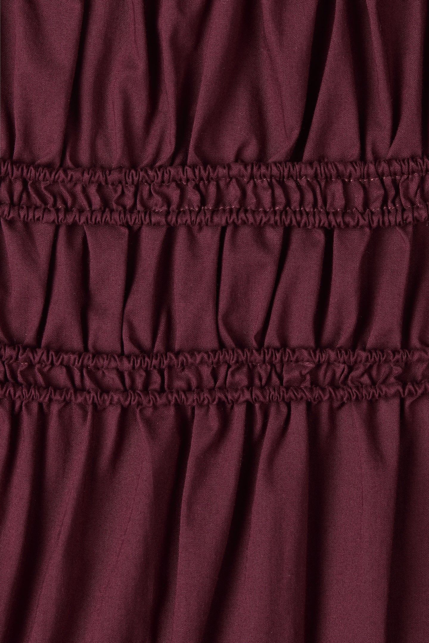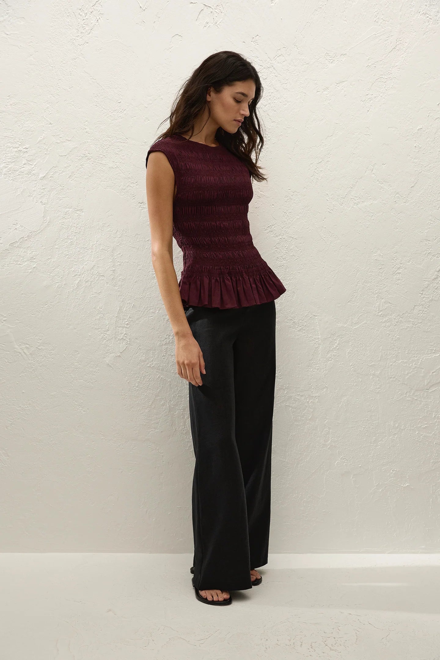 An everyday top, designed from a signature 100% BCI Certified organic cotton, yarn-dyed in a deep mulberry shade. Fitted through the bodice with a shirred effect, it features a high rounded neckline and short cap sleeves. It is finished with a gathered peplum hem. Style with a classic trouser for transeasonal wear.