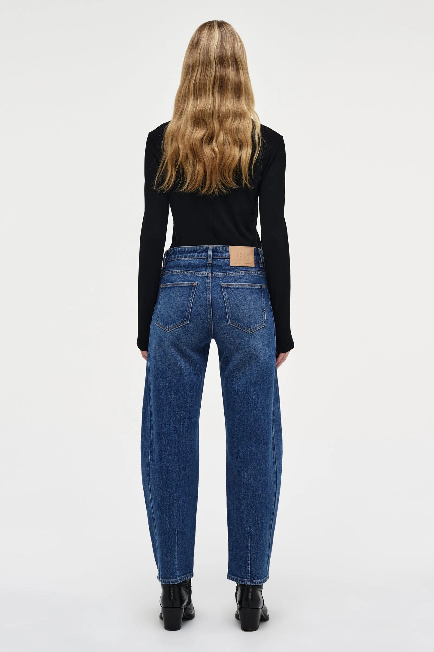 The Amber Barrel is a mid rise barrel leg jean that ends at the ankle.