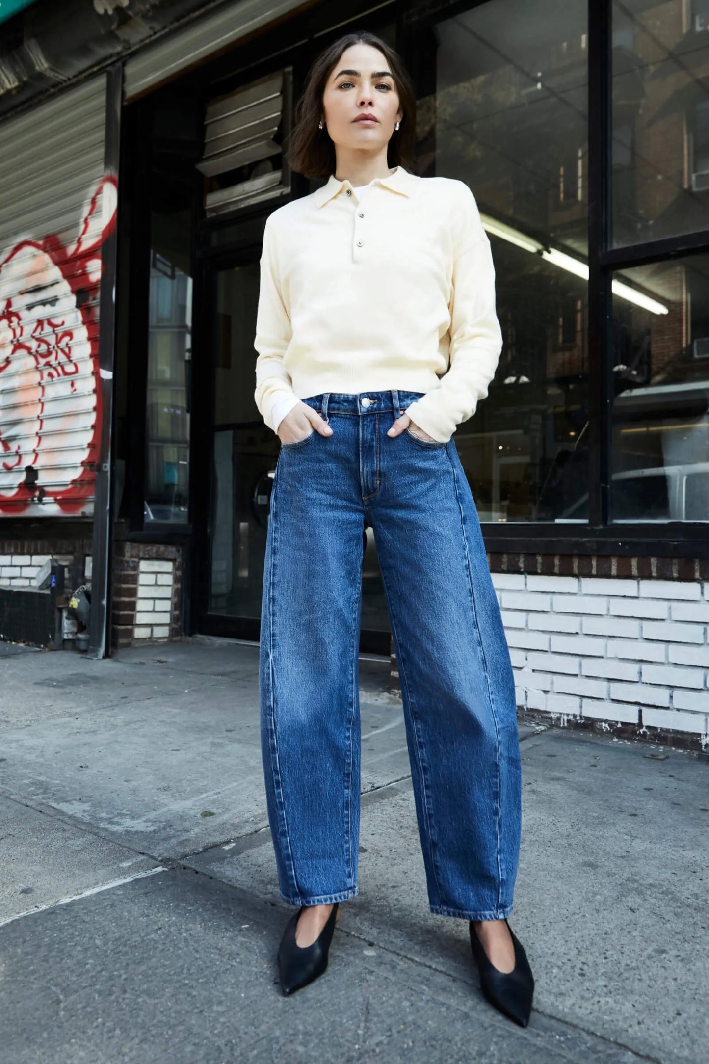 - A mid rise slim fit barrel leg jean that sits at the ankle