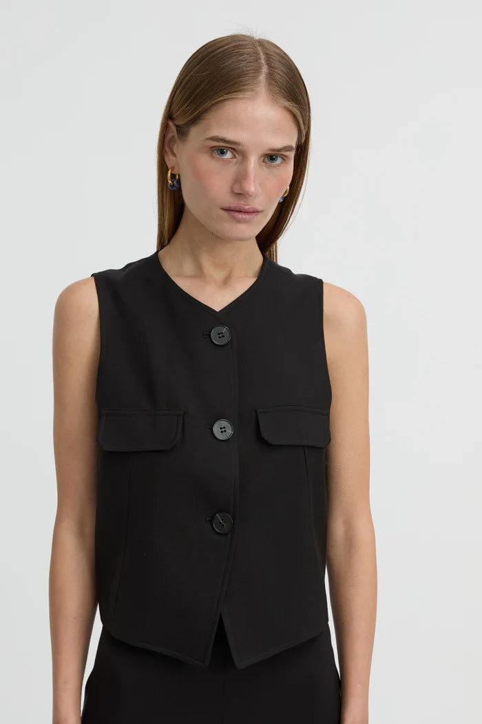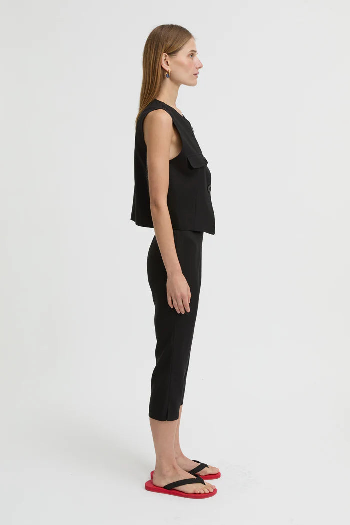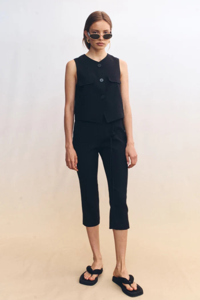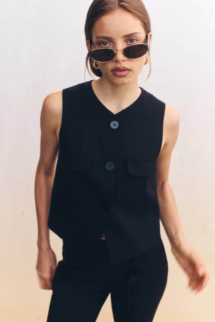 Tailored with restraint, the Anouk Vest is a modern take on suiting separates. Clean lines, oversized buttons and a boxy cut lend structure, while a soft drape keeps it effortless. Designed to pair back with the matching Capri for a refined set, or worn solo for a minimal edit.