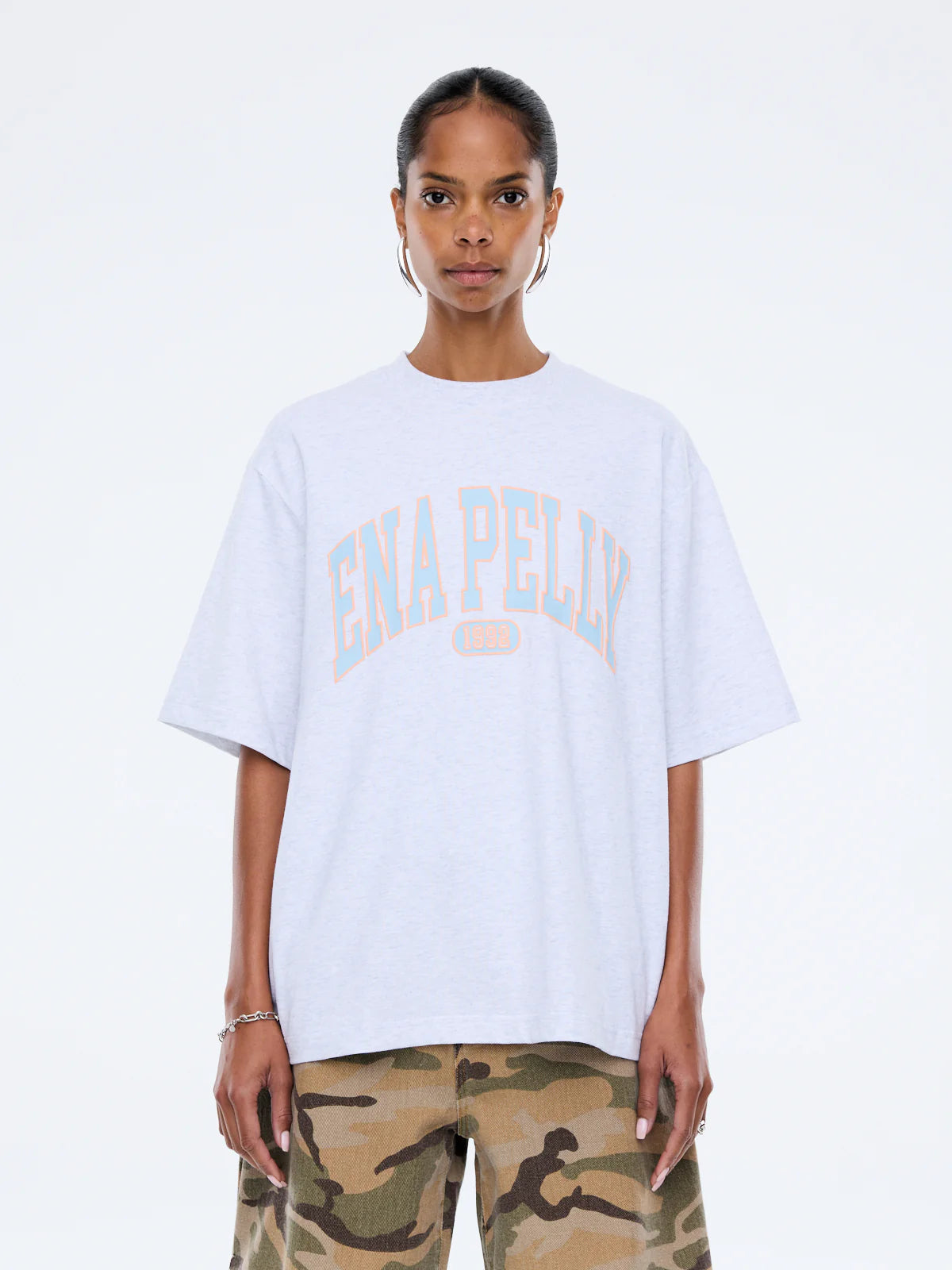 The Blue Collegiate Tee is crafted from cotton in white marle with a relaxed, boxy fit. Finished with a collegiate Ena Pelly puff-print graphic for a modern, textured finish.