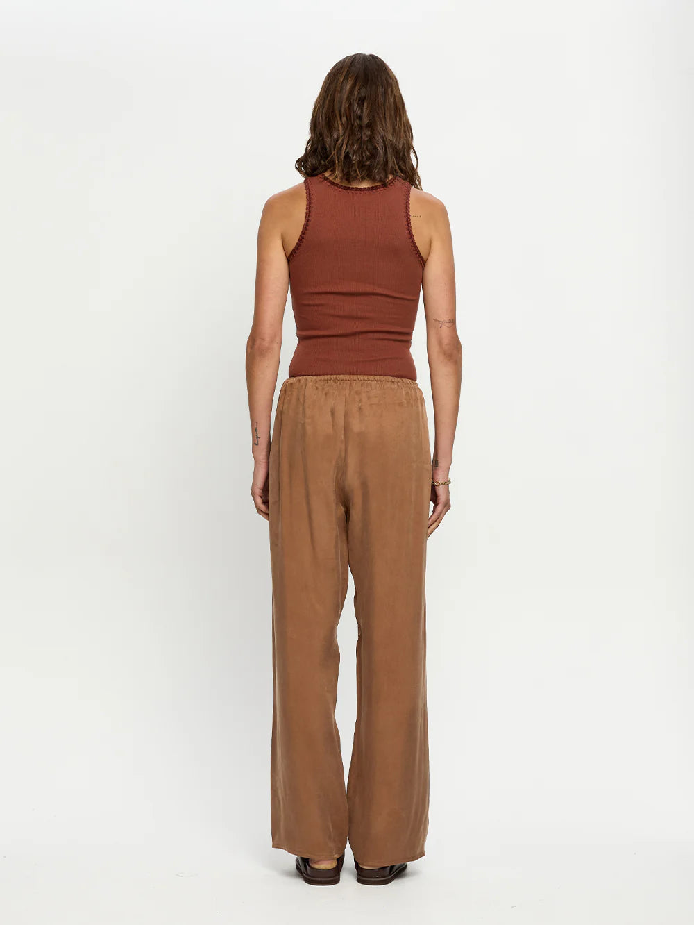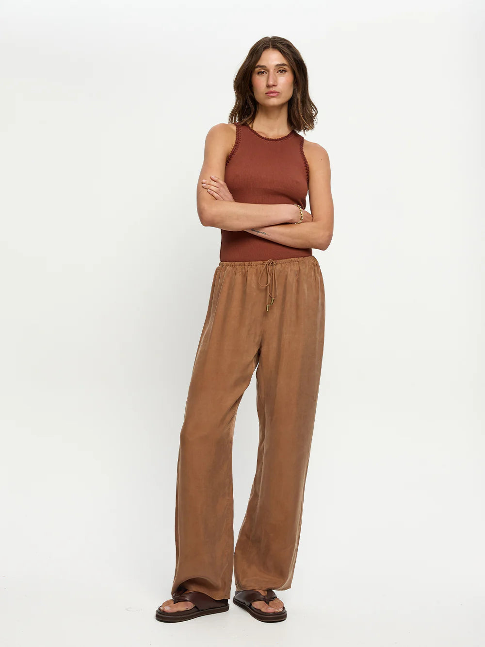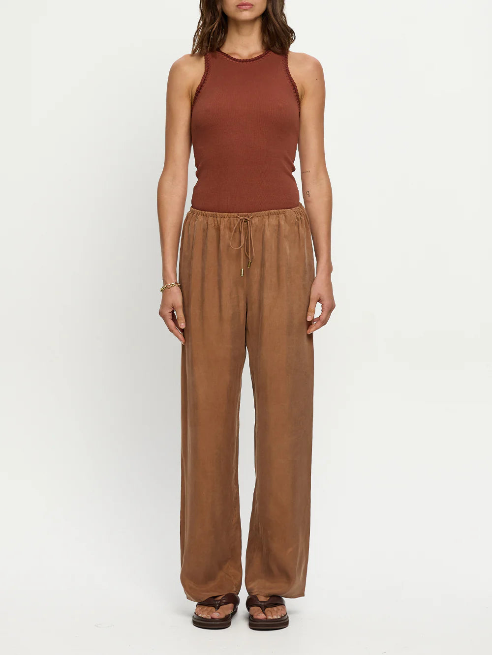 The Blythe Pant in chocolate brown features a relaxed straight-leg silhouette with an elasticated waistband and adjustable drawcord for everyday comfort. Easy and versatile, it offers a refined approach to relaxed dressing.