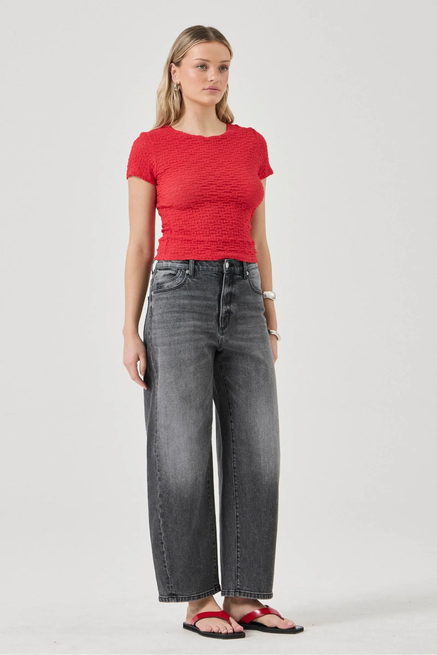 Gigi Barrel is a super high rise jean that holds through the seat, balancing the sculptural leg silhouette.