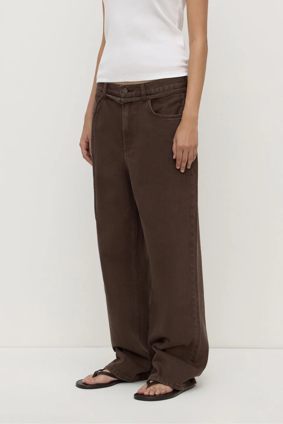 Our Loose Fit Jean in dark ganache is a relaxed silhouette that provides shape through the waist with the removable tie belt. Designed to sit mid rise, they offer a loose fit through the leg.