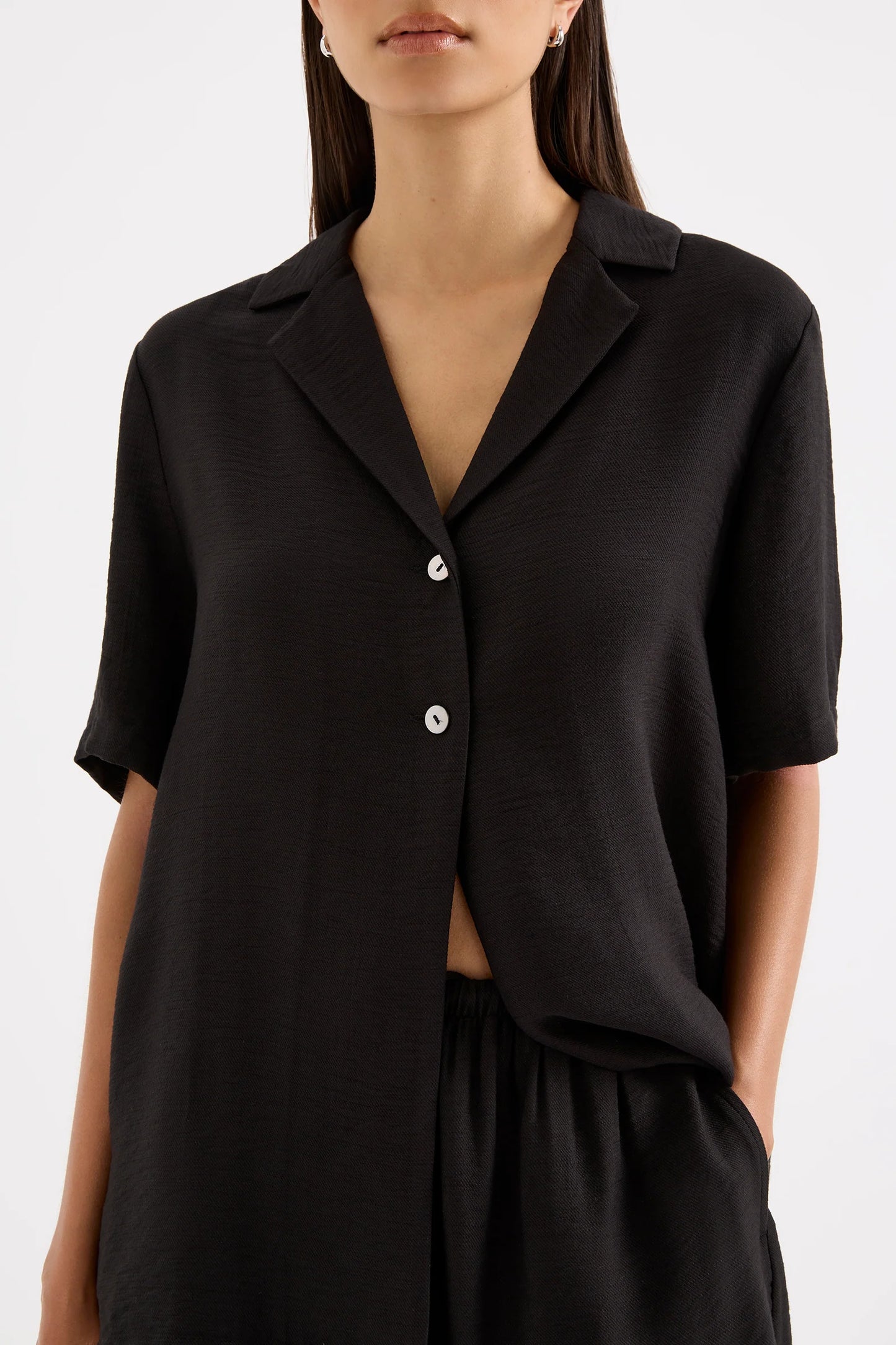 The Mona Shirt is crafted from a viscose blend fabrication that has a soft, smooth hand feel. This oversized shirt features a traditional shirt collar, front two button closure and slits at hem.
