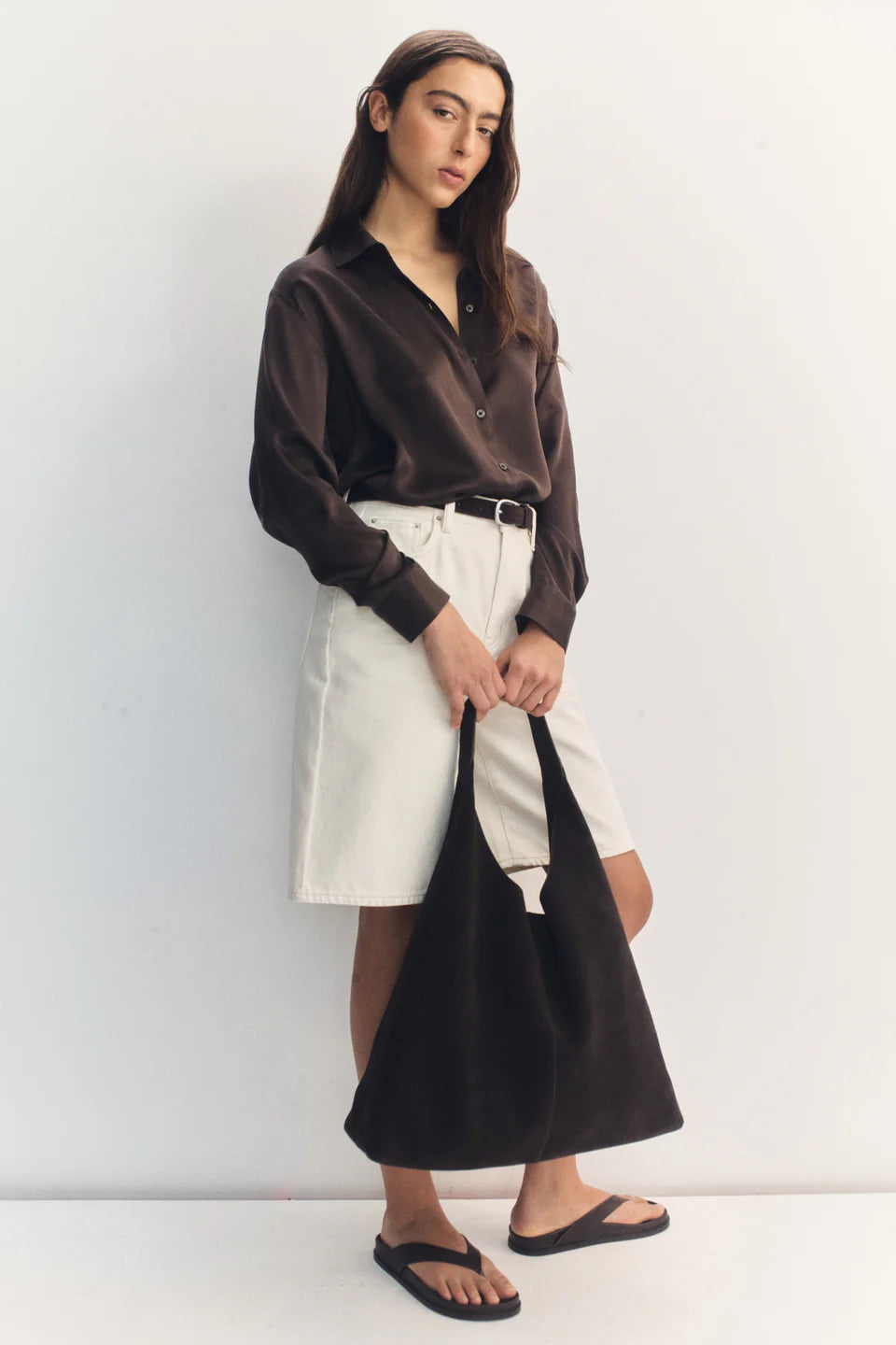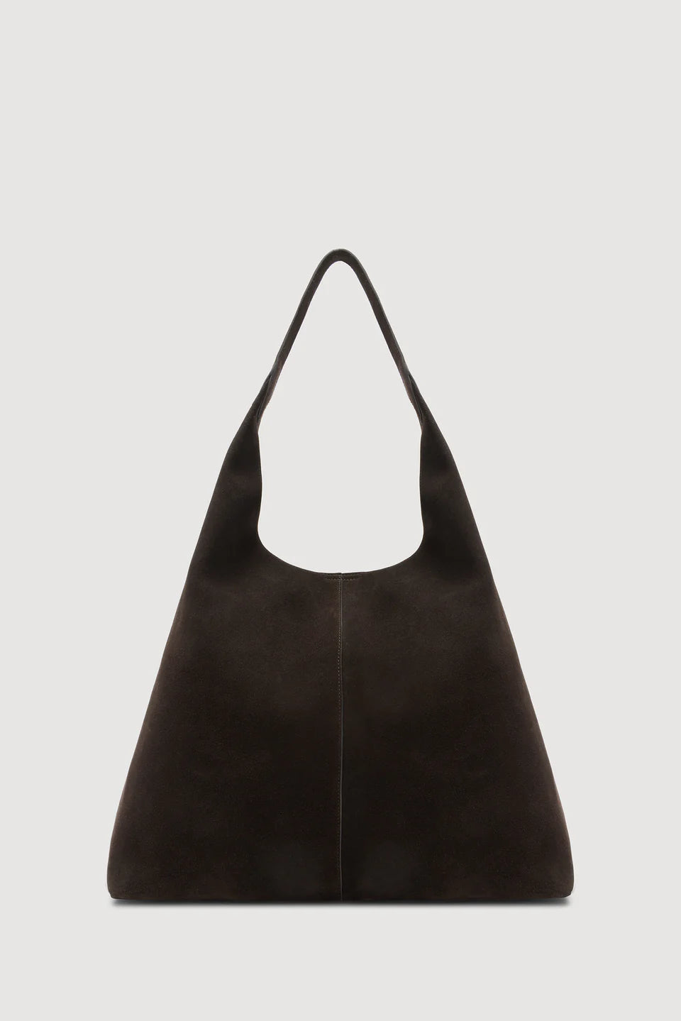 Relaxed everyday shoulder bag crafted from a textured suede leather. Features a structured base and reinforced handle to maintain form, as well as an internal patch pocket for storing essentials.