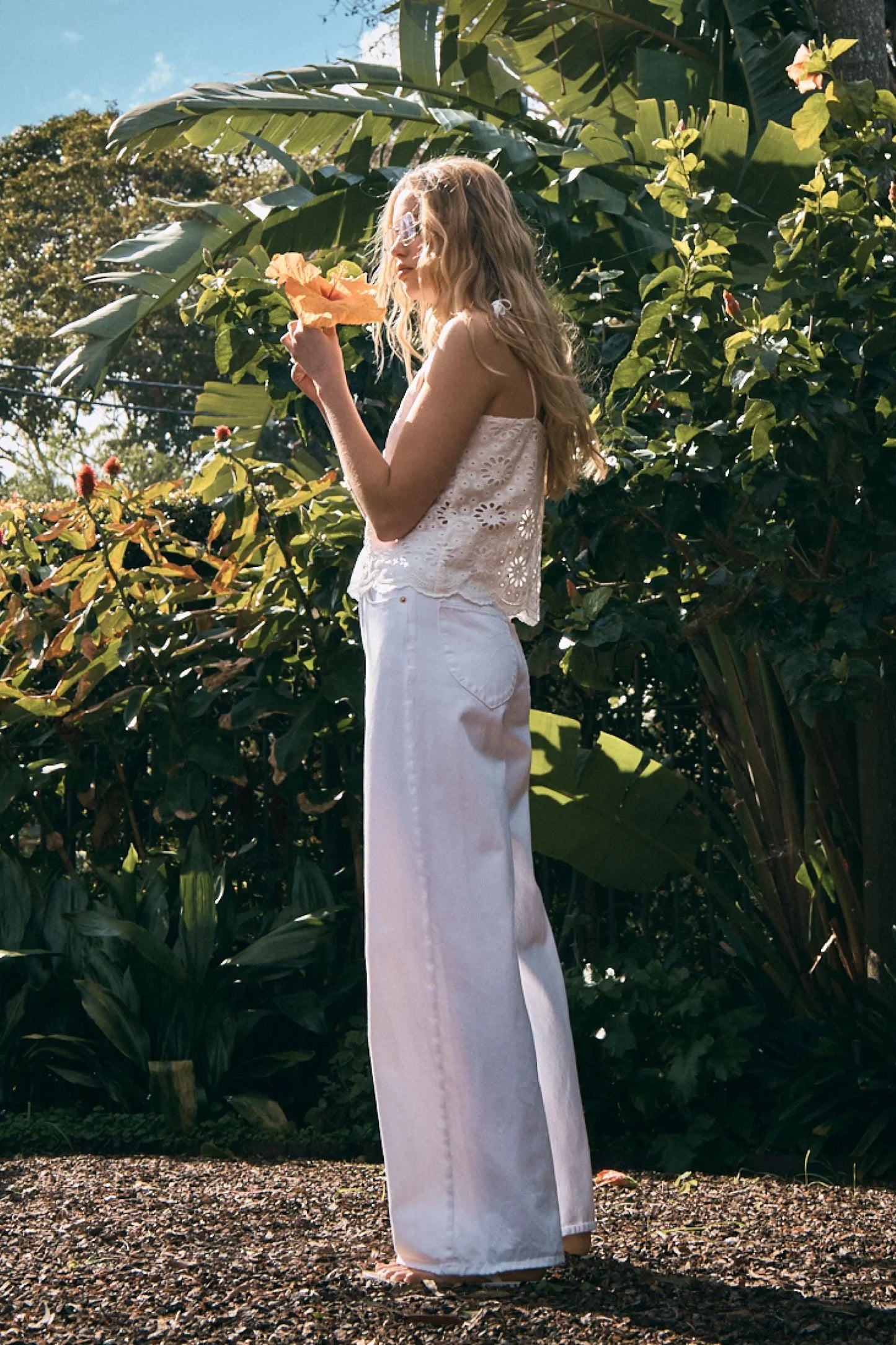 This is a high-rise, wide leg jean, made with a non stretch denim. Fits true to size.