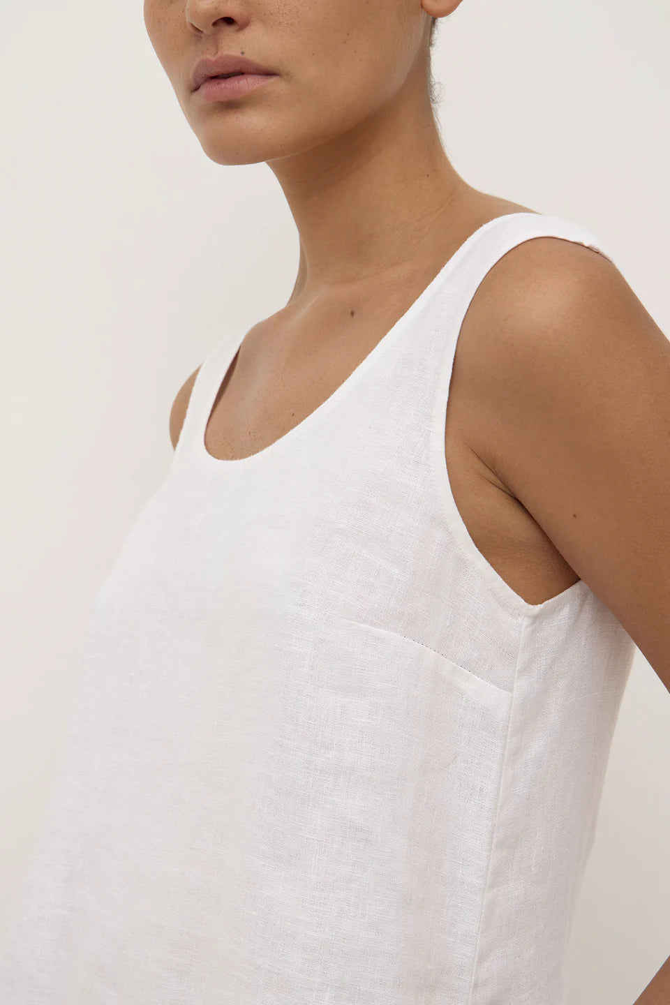 A-line scoop neck mini dress crafted from 100% linen. Offers a relaxed fit on the body.
