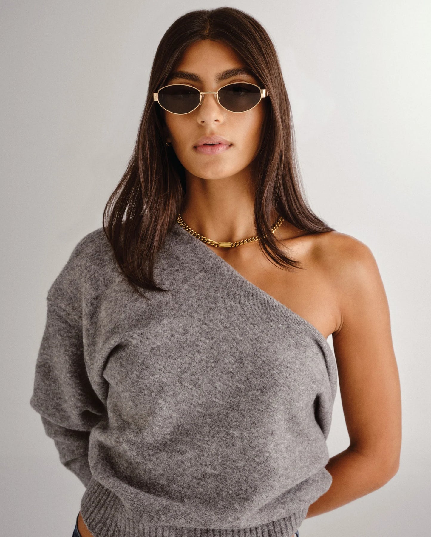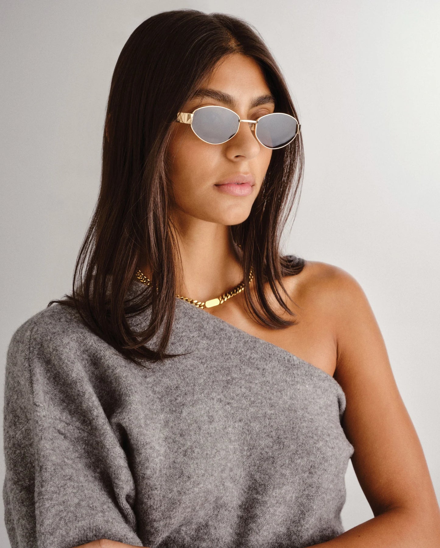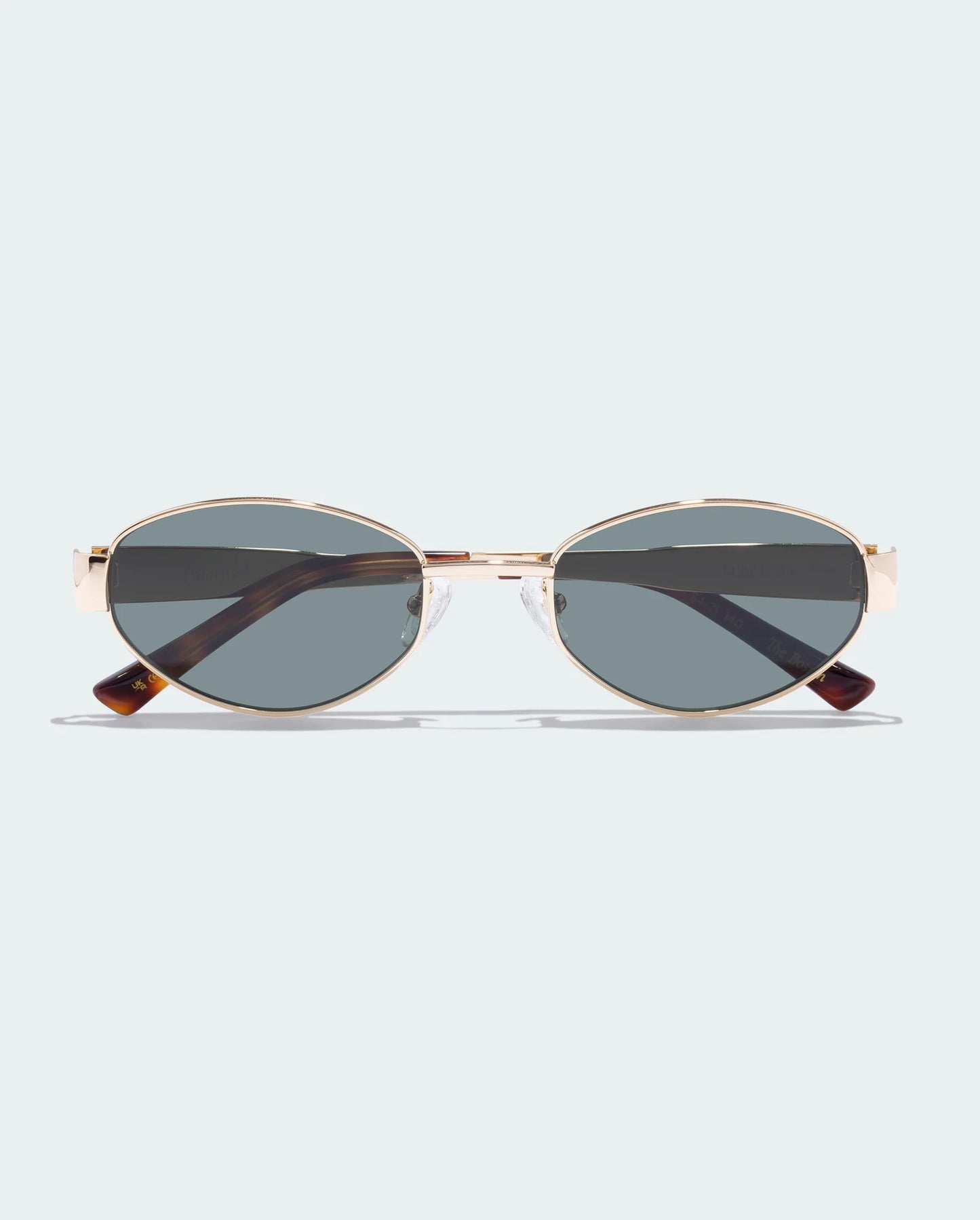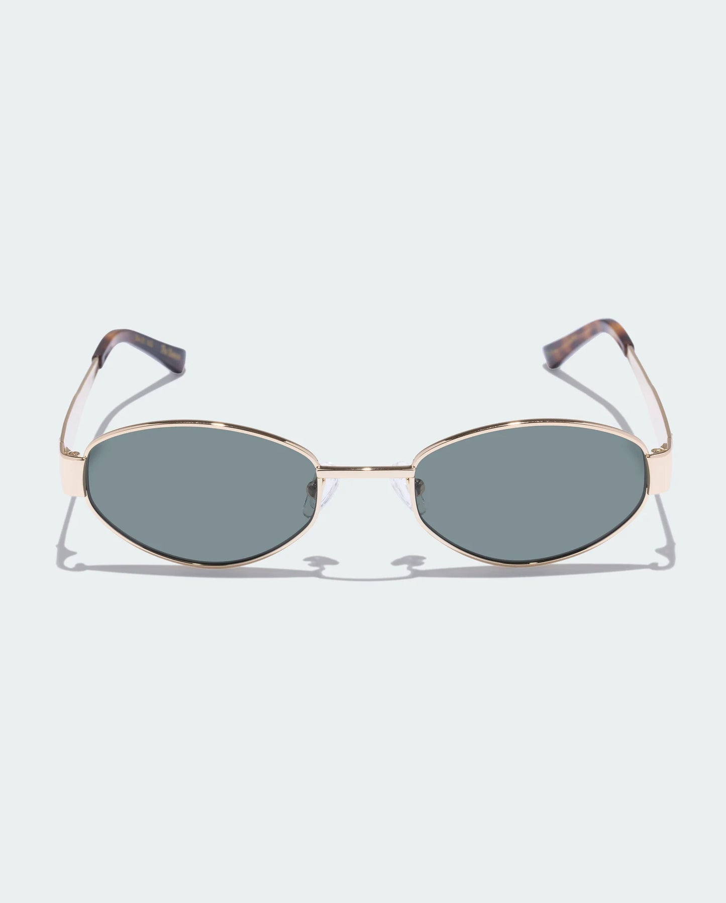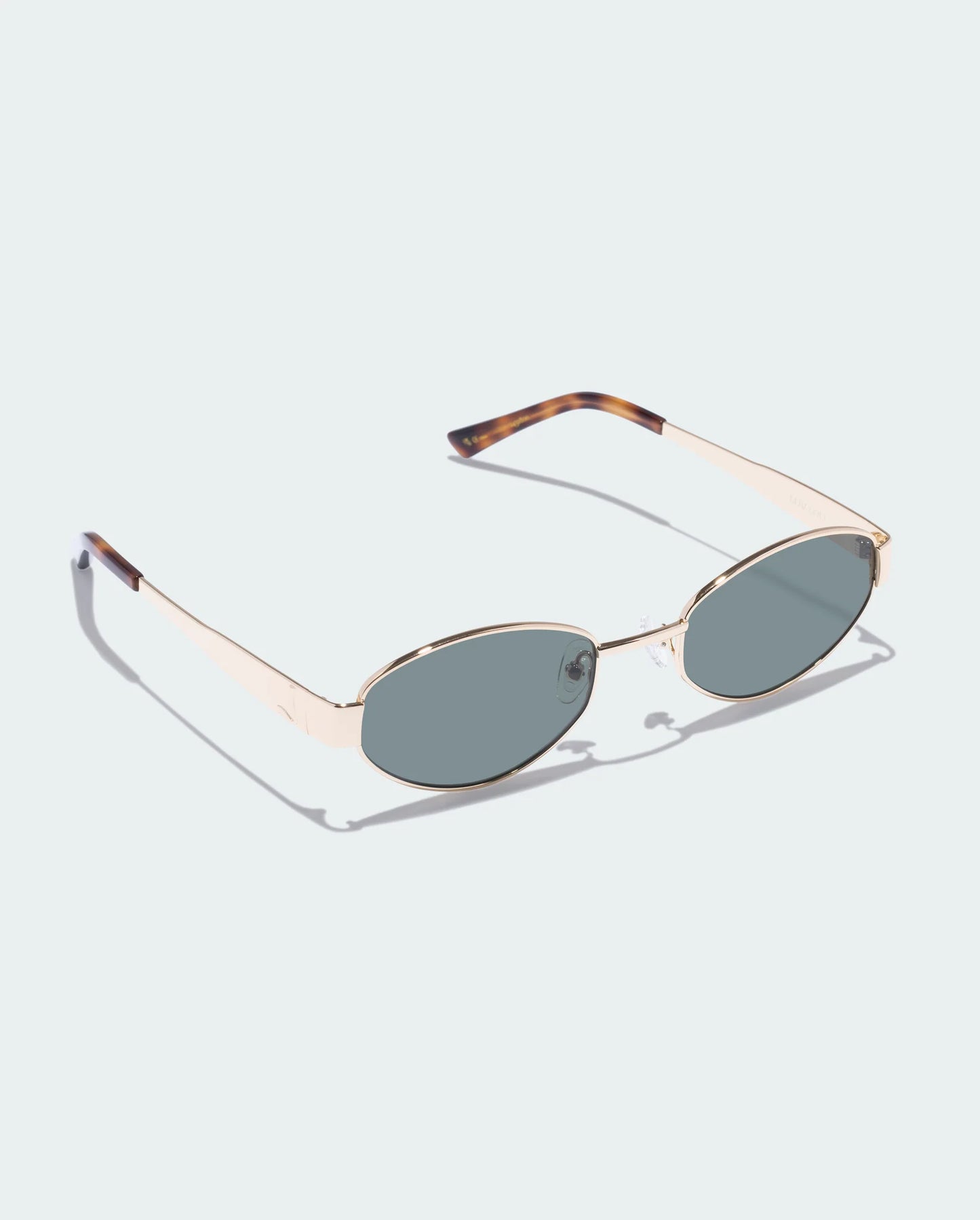 The Boston is an ode to the 90’s, which evokes a vintage aesthetic. This oval frame features a statement gold metal arm, with a signature brand stamp detail. This premium wire frame comes with a khaki polarised lens adding to it’s high end quality.