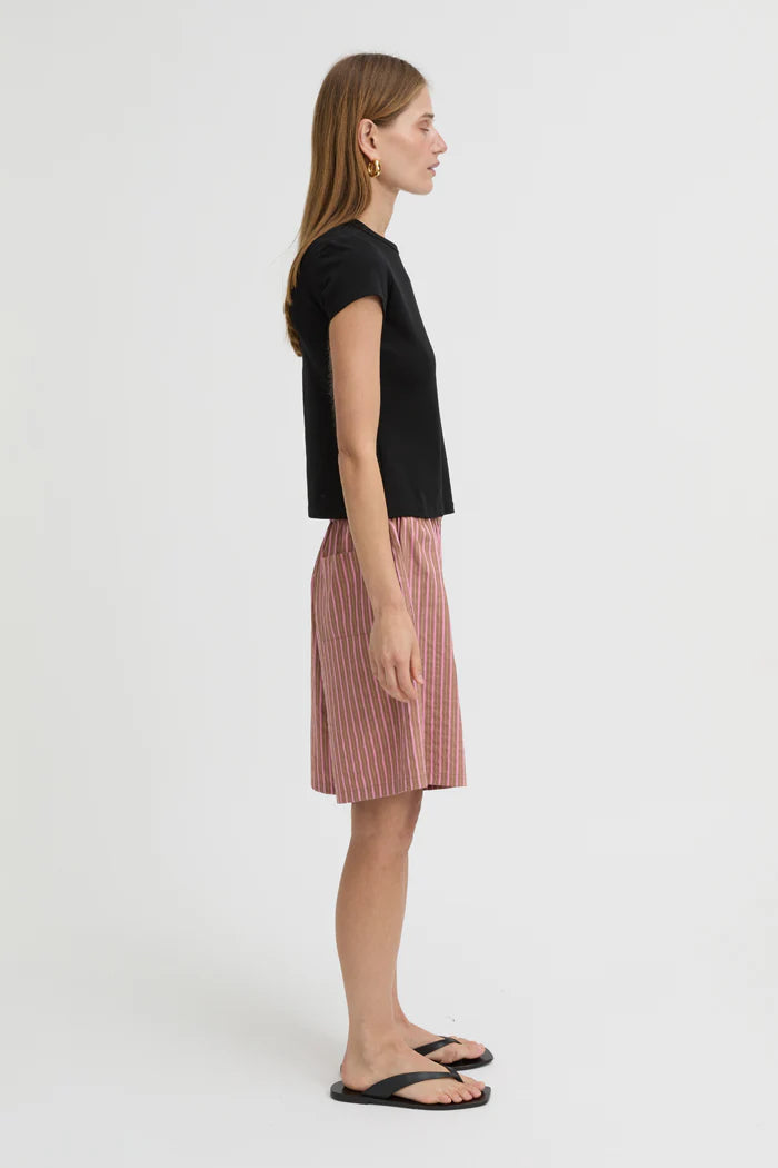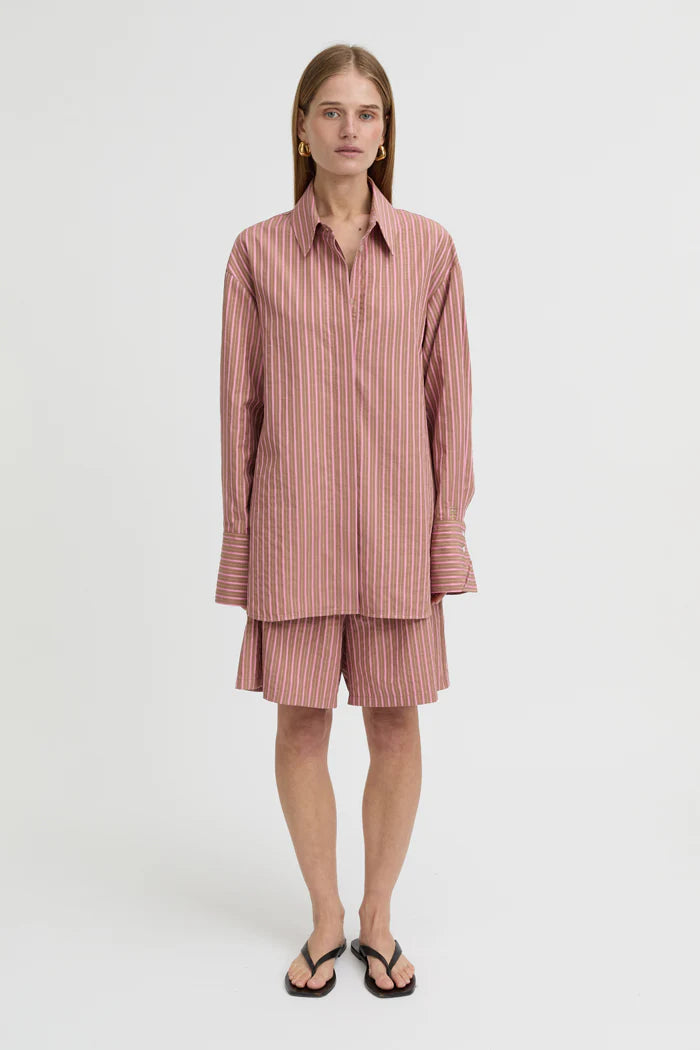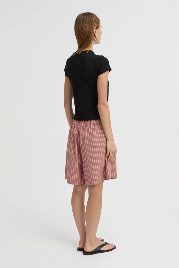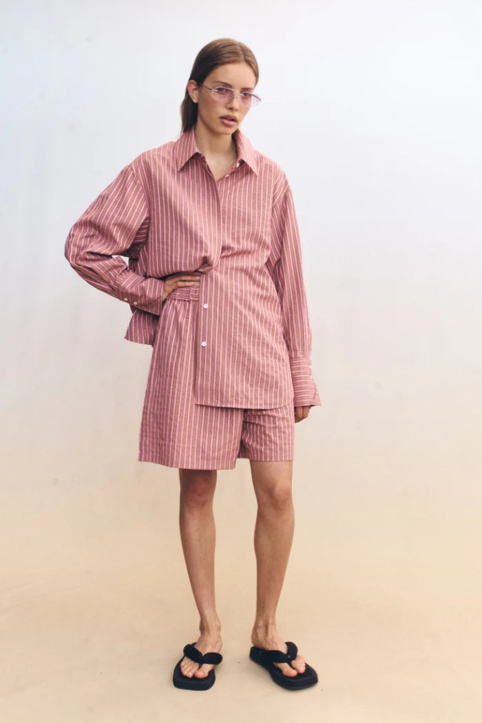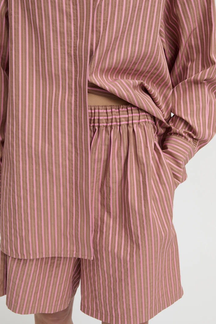 The Zola Shorts in Brown combine comfort and contemporary style. Lightweight cotton, a high elasticated waistband, and a relaxed silhouette make them perfect for everyday wear, while the tonal stripes provide understated texture. Coordinate with the Zola Shirt for a complete set, or pair with neutral layers for versatile, off-duty styling.
